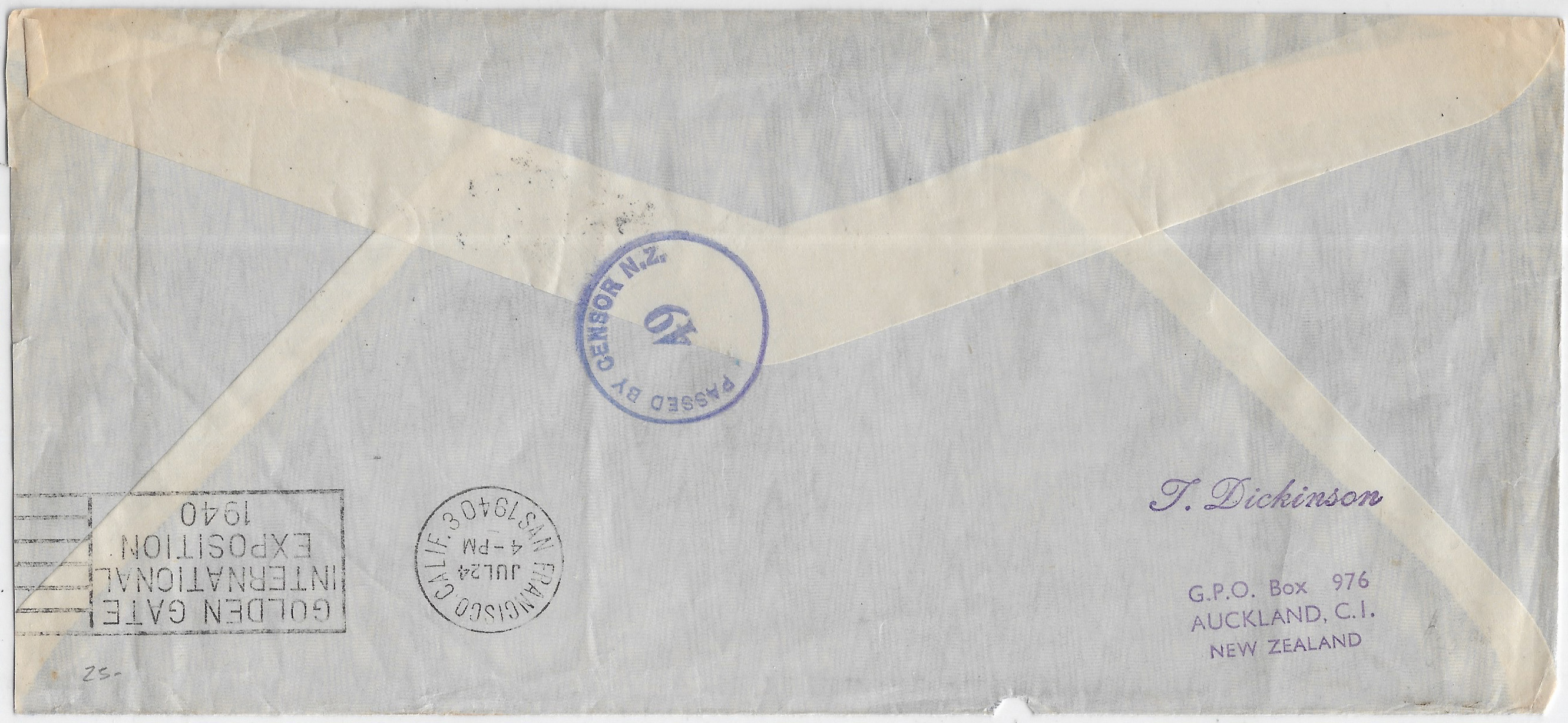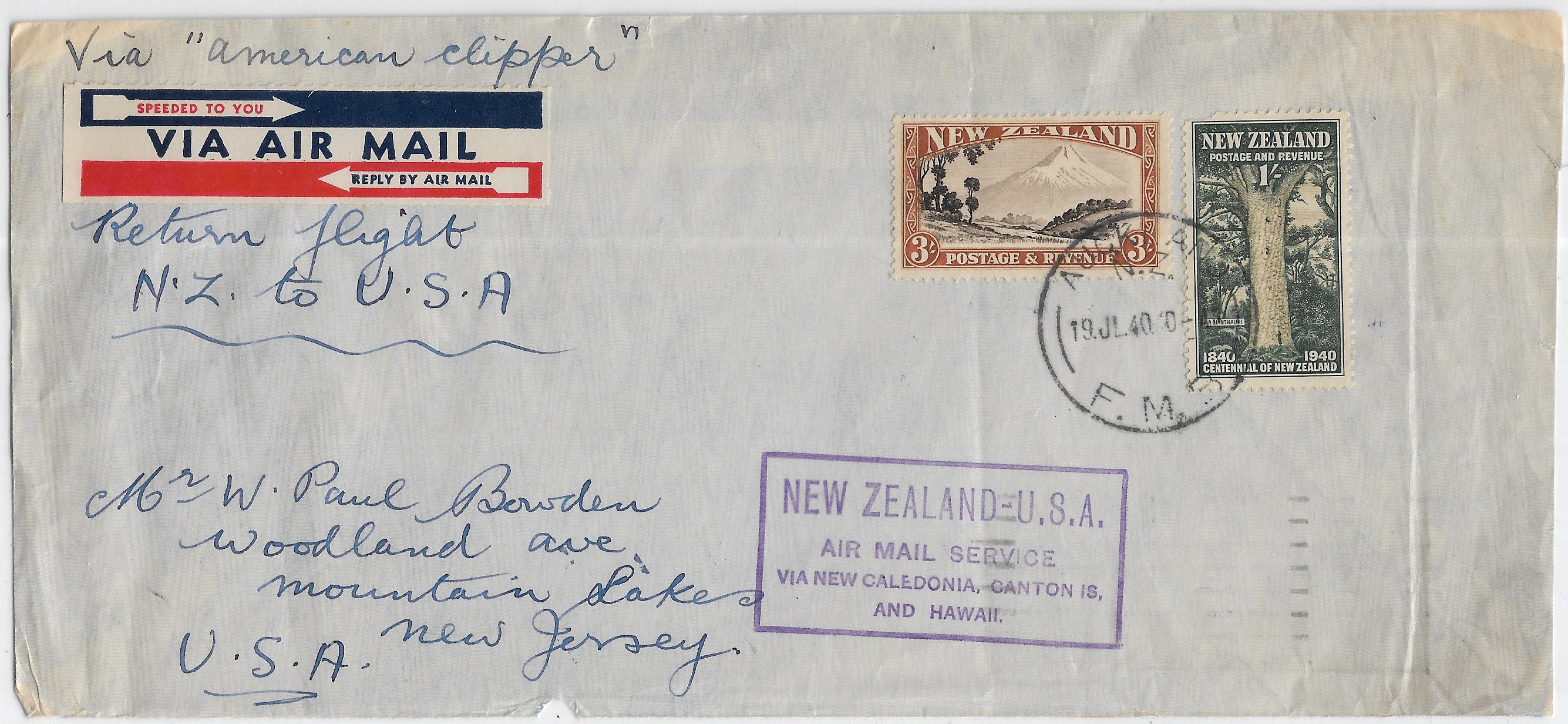 1940 Auckland, NZ to Mountain Lake, NJ Airmail via American Clipper. back stamped San Francisco. New Zealand censor handstamp.