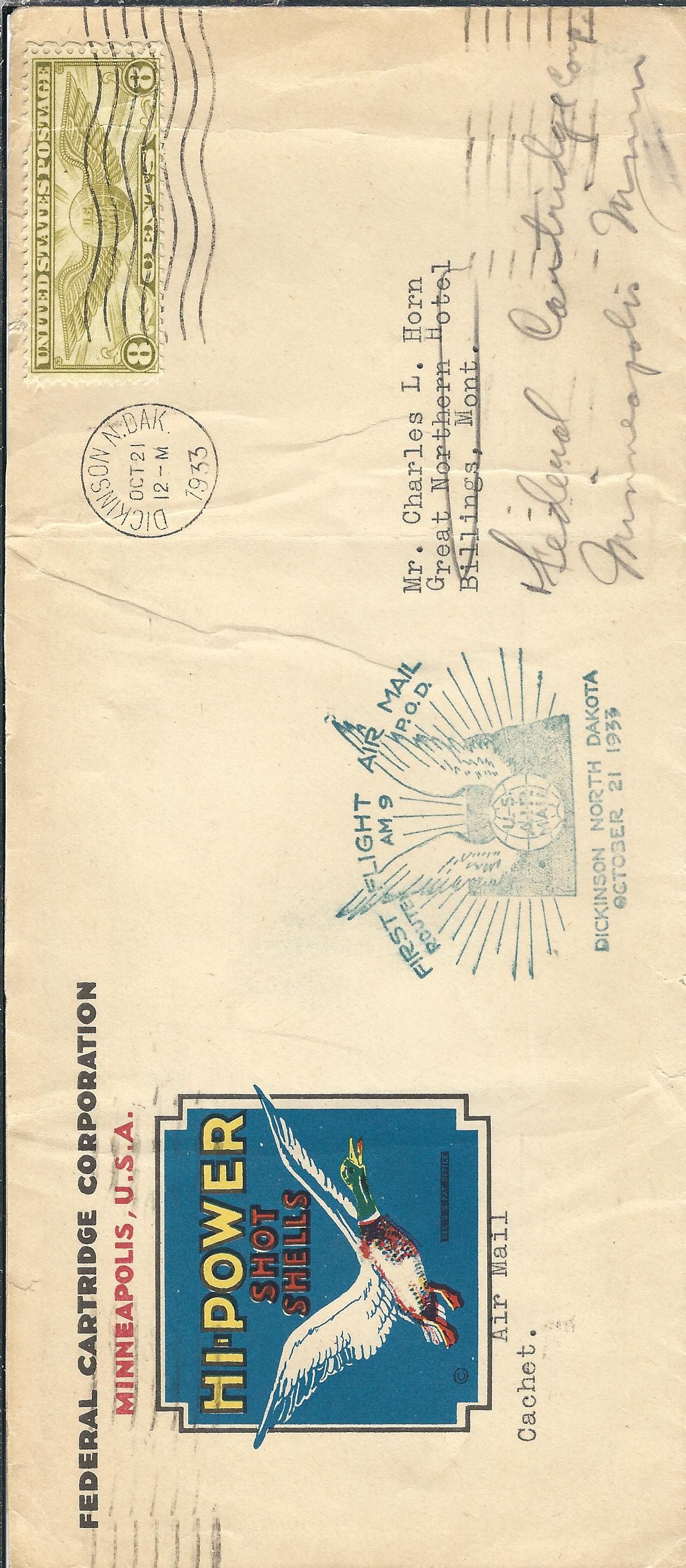 Advertising: Hi-Power Shot Shells, Dickinson, ND to Billings, MT 1933 1st Flight CAM-9 fwd Minneapolis. back stamped Billings.