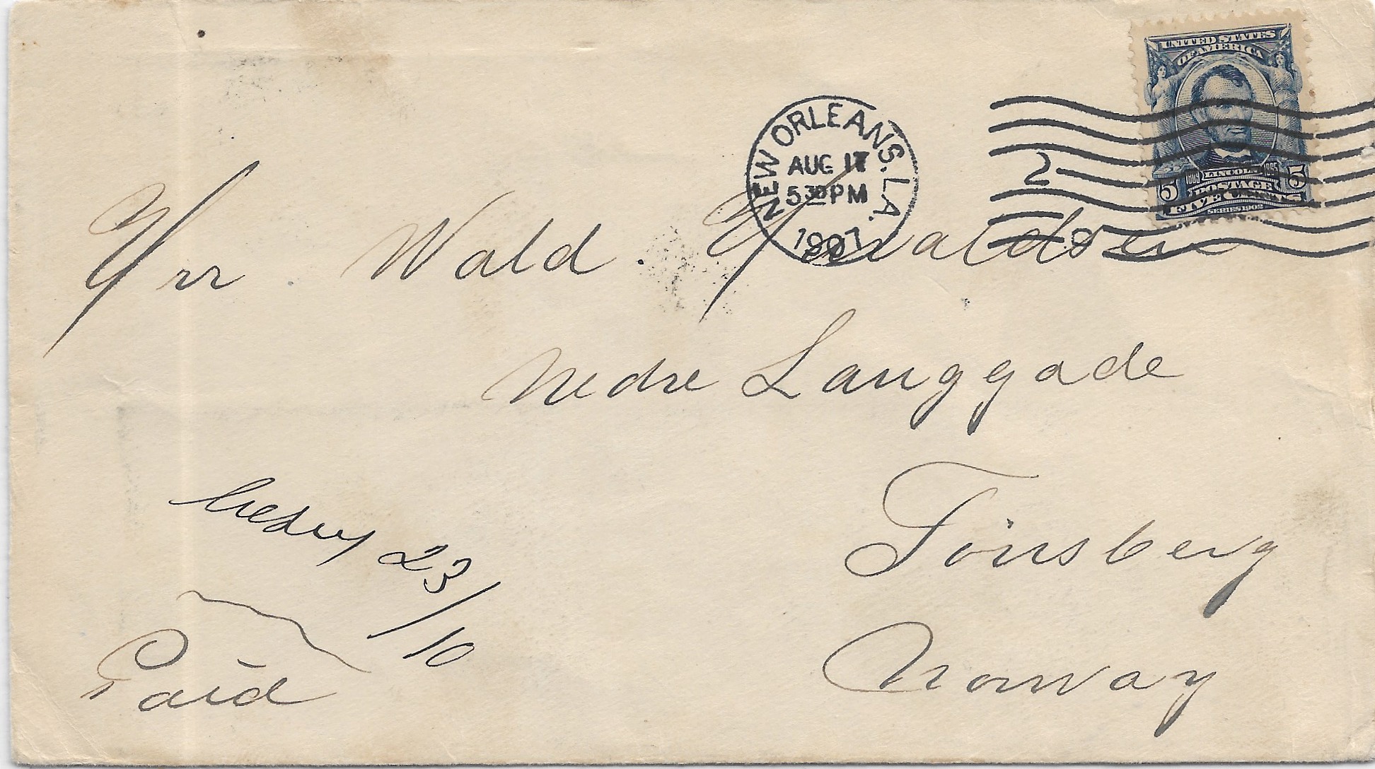 1907 New Orleans, La to Toinsberg, Norway. back stamped Toinsberg.