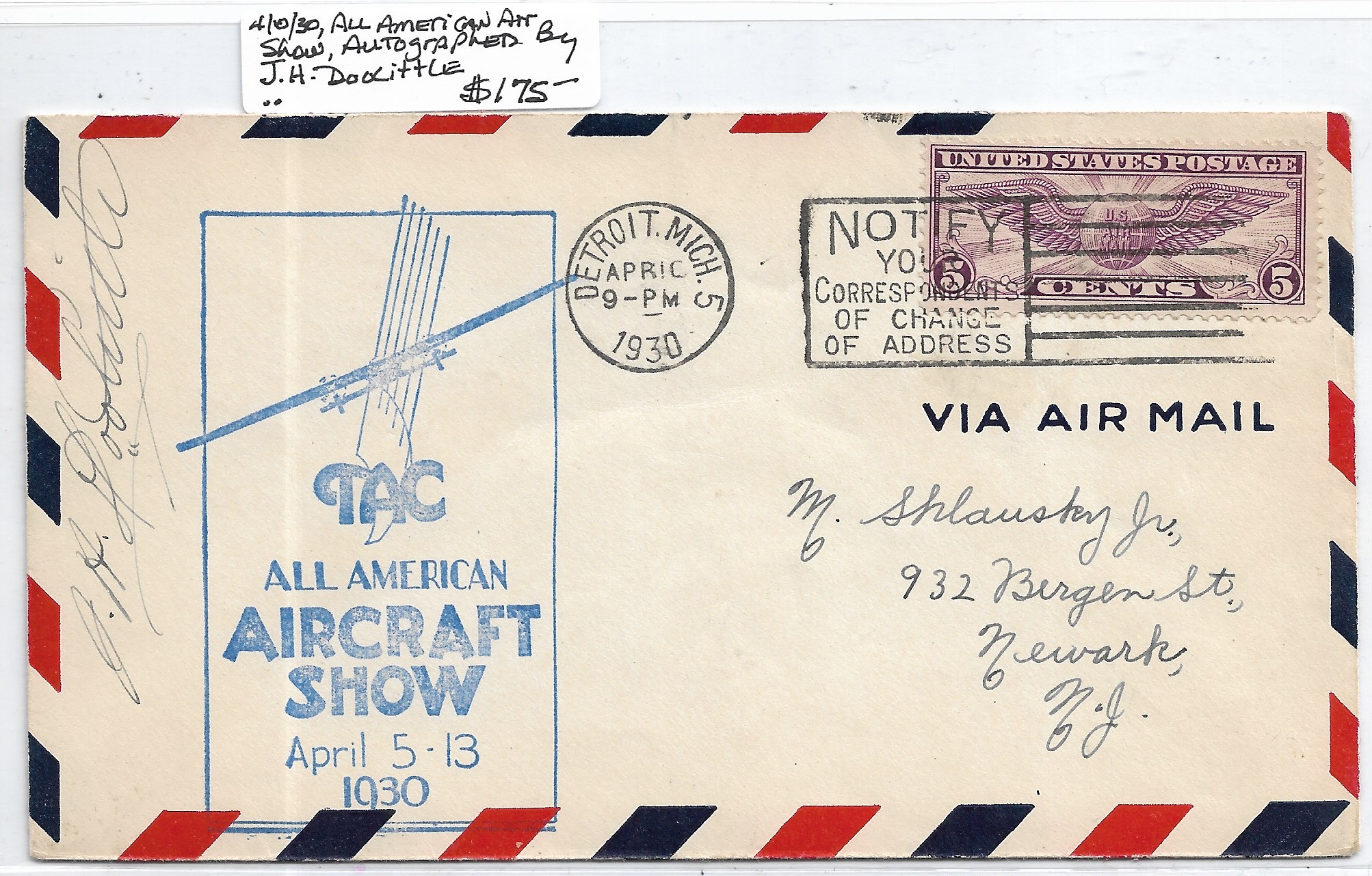 1930 Detroit, MI All American Aircraft Show to Newark, NJ signed by Jimmie Doolittle.