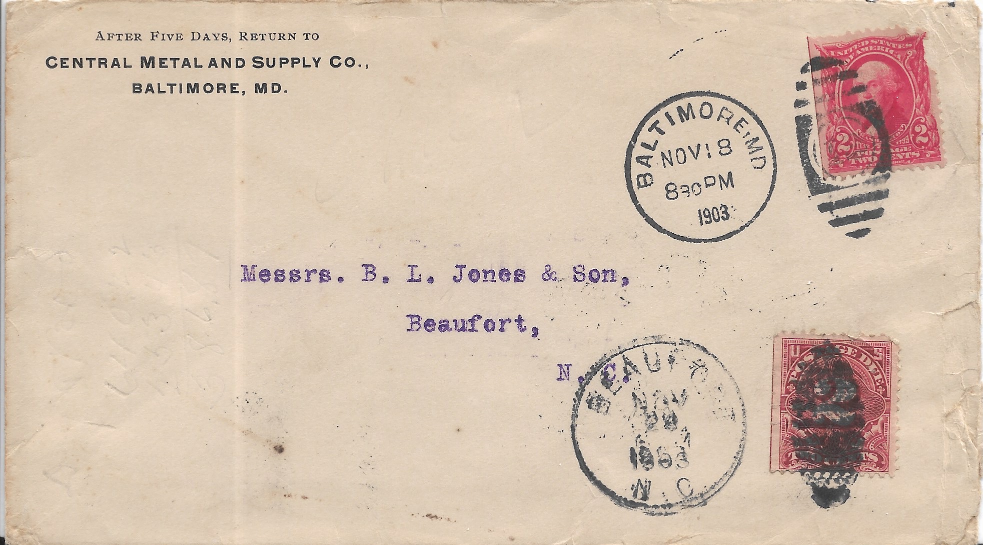 1903 Baltimore to Beaufort, NC w/Postage Dues Sc # J39. K/H cover. back stamped Beaufort.