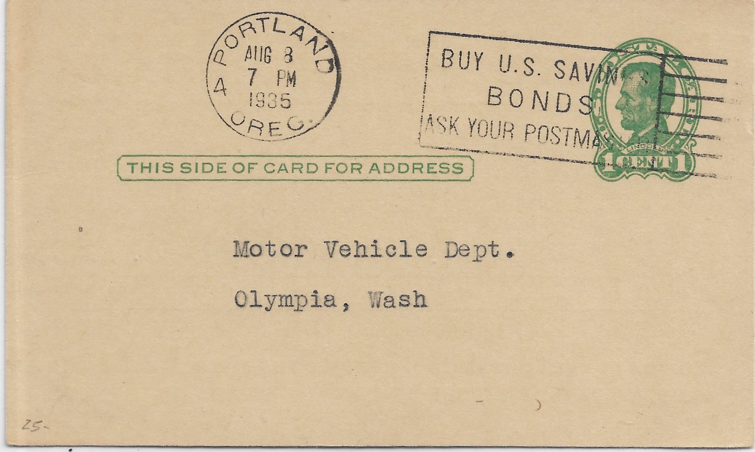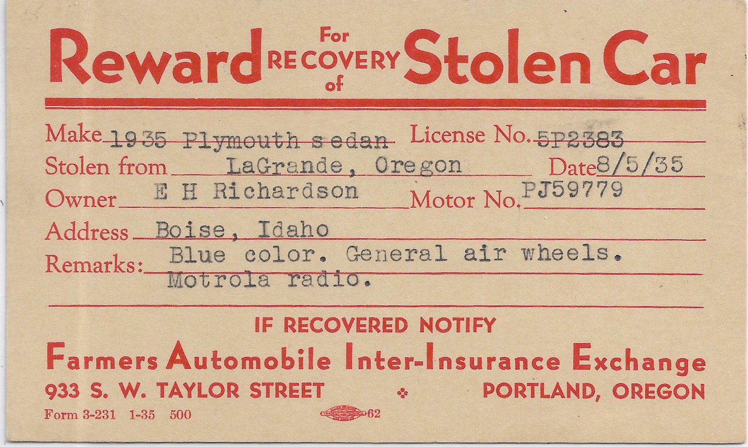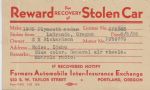 1935 Portland, Or to Olympia, Wa Reward for Recovery of Stolen Car.