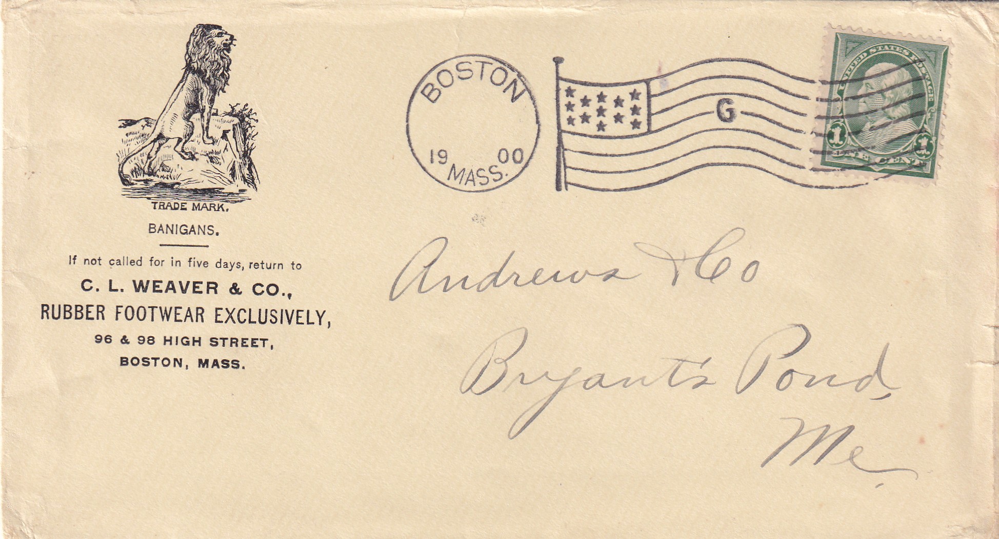 Advertising: 1900 C.L. Weaver Rubber Footwear, Boston, Ma to Bryants Pond, Me.