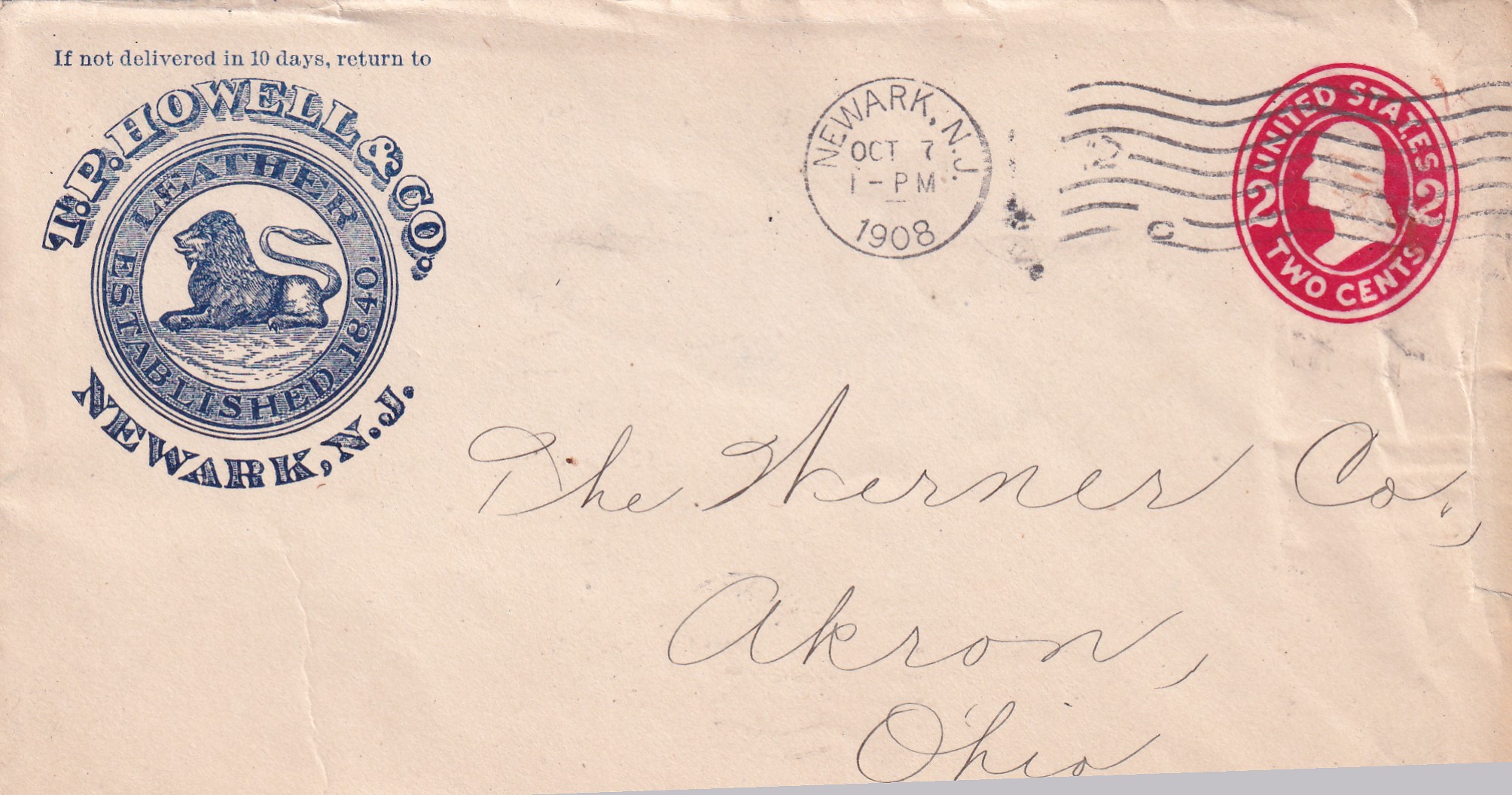 Advertising: 1908 T.P. Howell, Leather, Newark, NJ to Akron, OH. back stamped Akron.