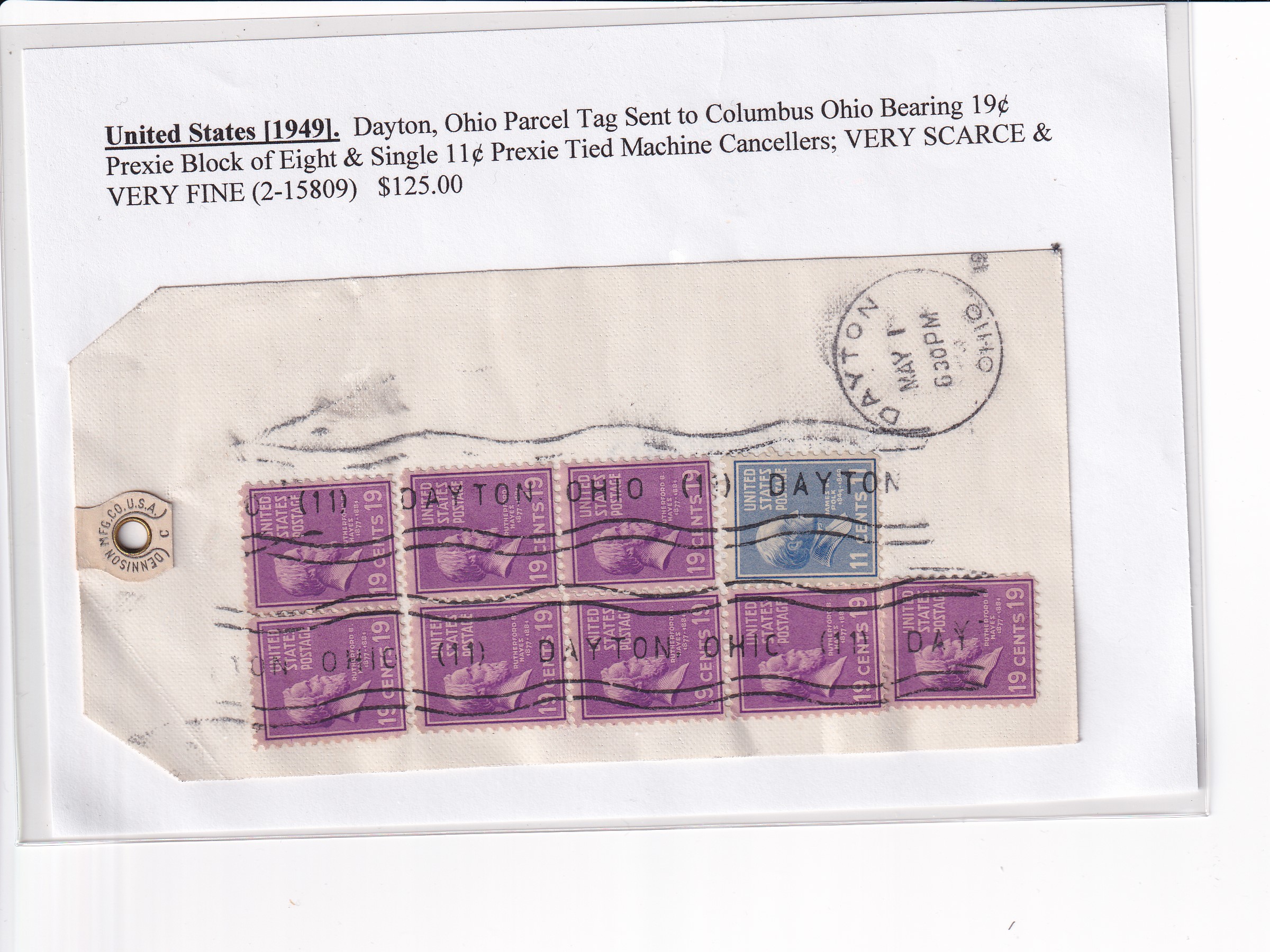 1949 Dayton to Columbus, OH, Parcel Tag 11c & 8 x 19c Prexies.