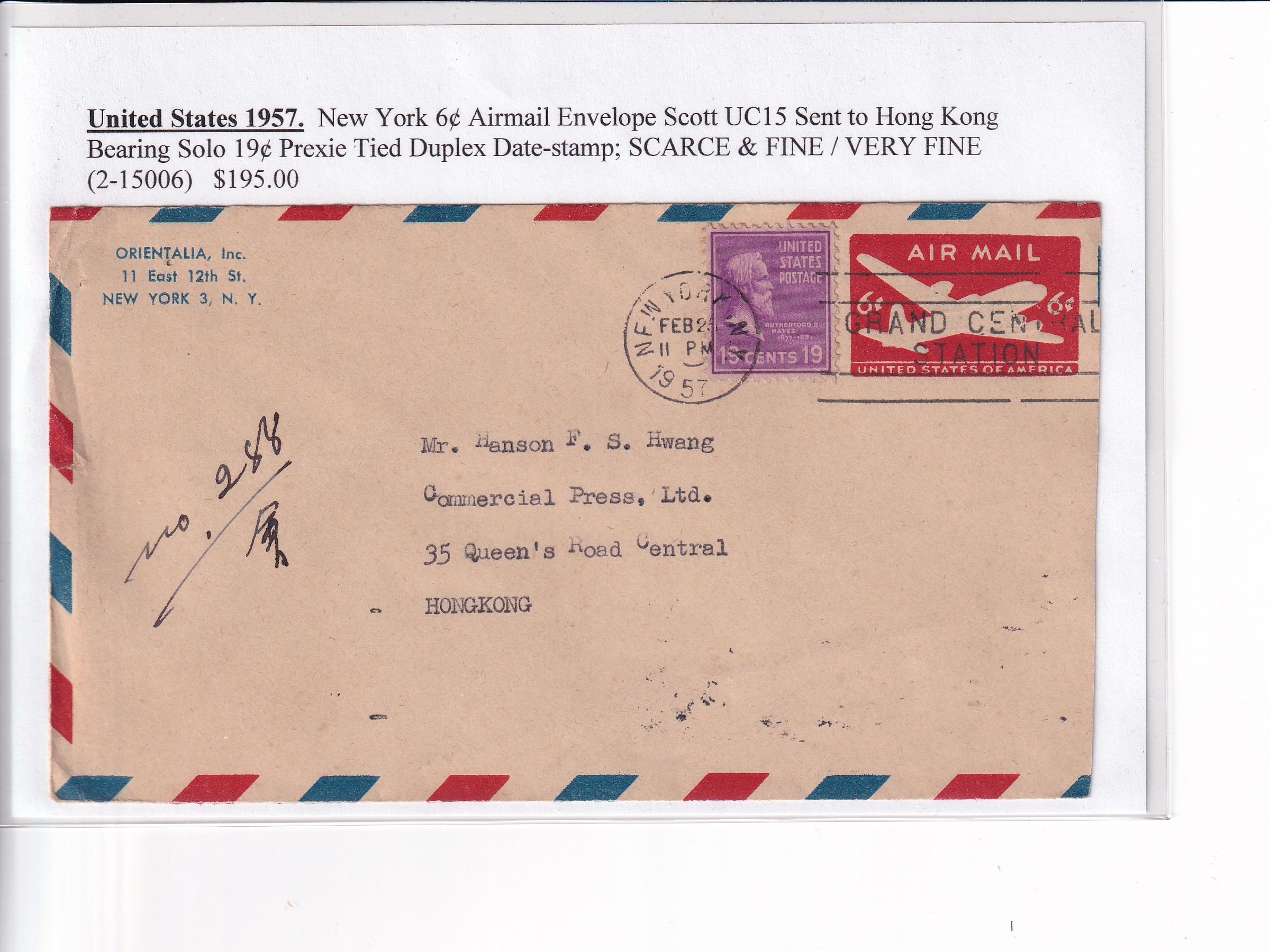 1957 New York to Hong Kong, Airmail UC15 and 19c Prexie. back stamped Hong Kong.