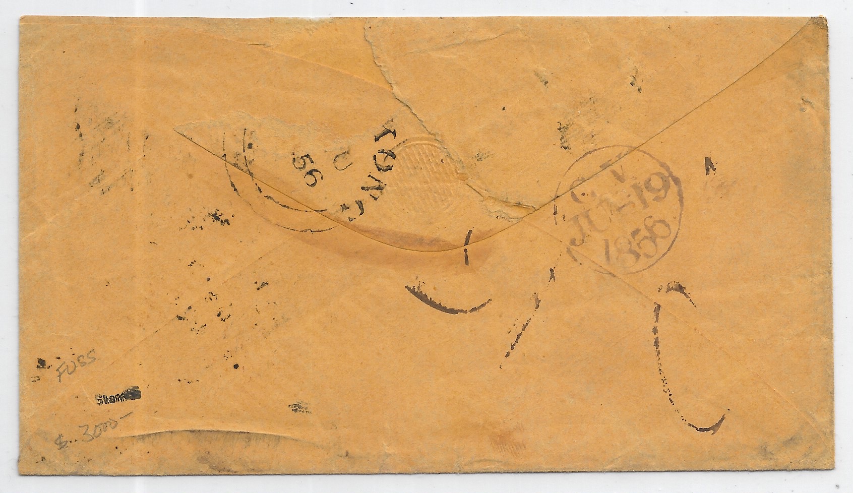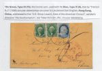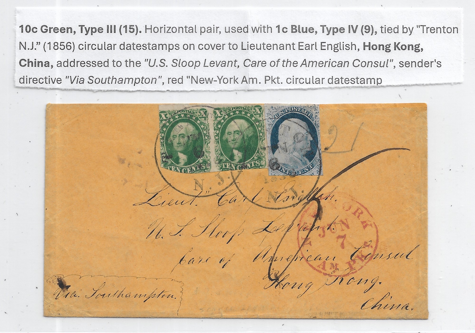 1856 Trenton, NJ to Lt English, U.S. Sloop Levant, Care of American Consul, Hong Kong. Sc #15 x 3 & Sc #9. via Southampton. New York red pkt. back stamped Southampton & Hong Kong.