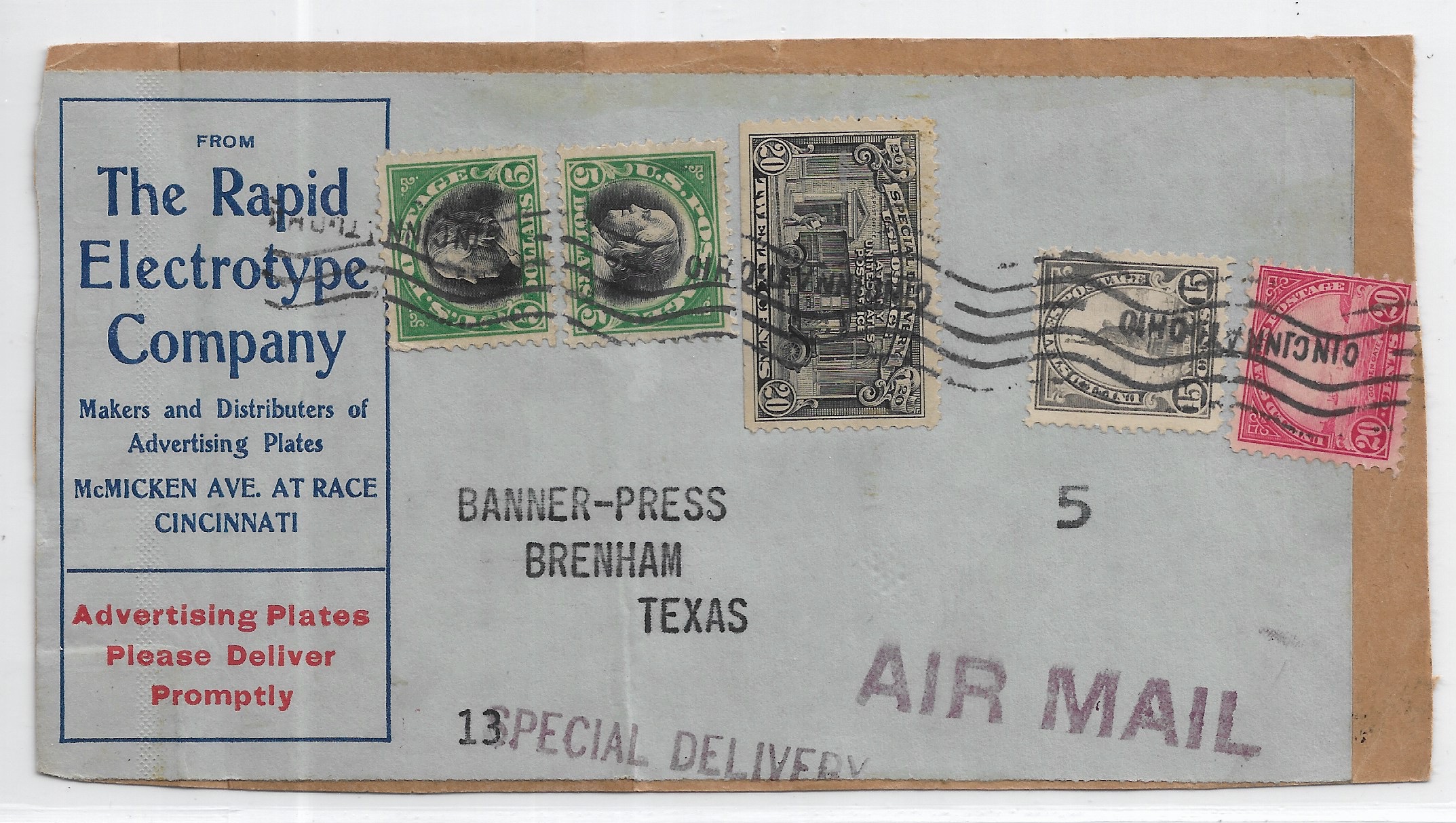 193x Cincinnati, OH to Brenham, Tx Special Delivery (Parcel Piece) w/Sc #524 x 2. 15c & 20c 4th Bureau issue and 20c Special D.