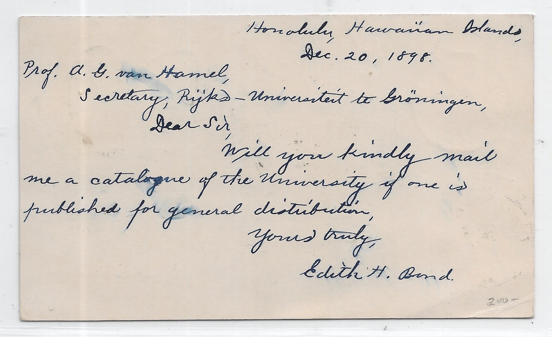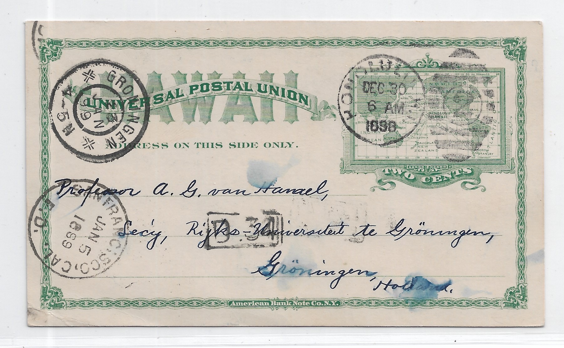 1898 Honolulu, Hawaii to Groningen, Holland via San Francisco, Ca.