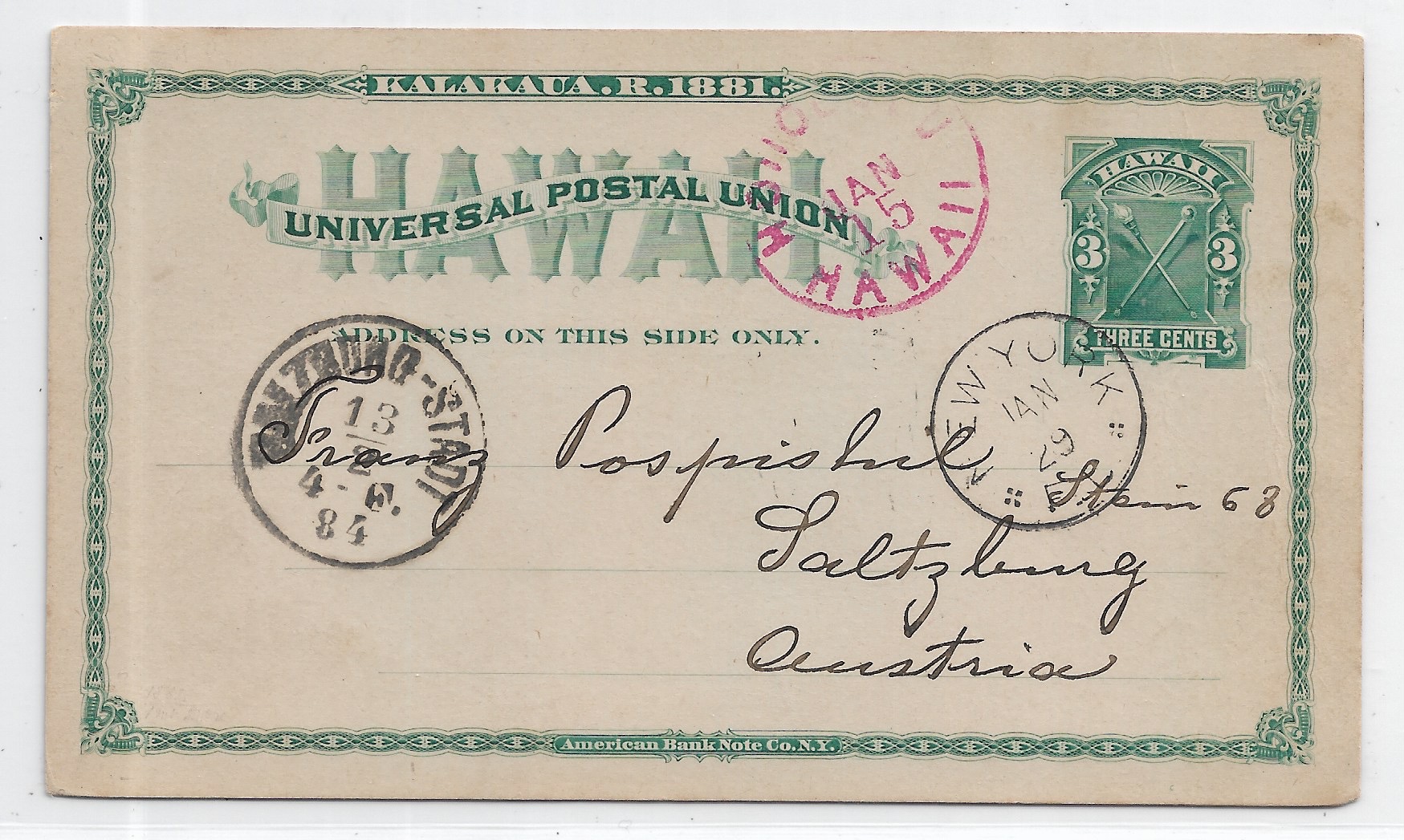 1884 Honolulu, Hawaii to Salzburg, Austria via New York.