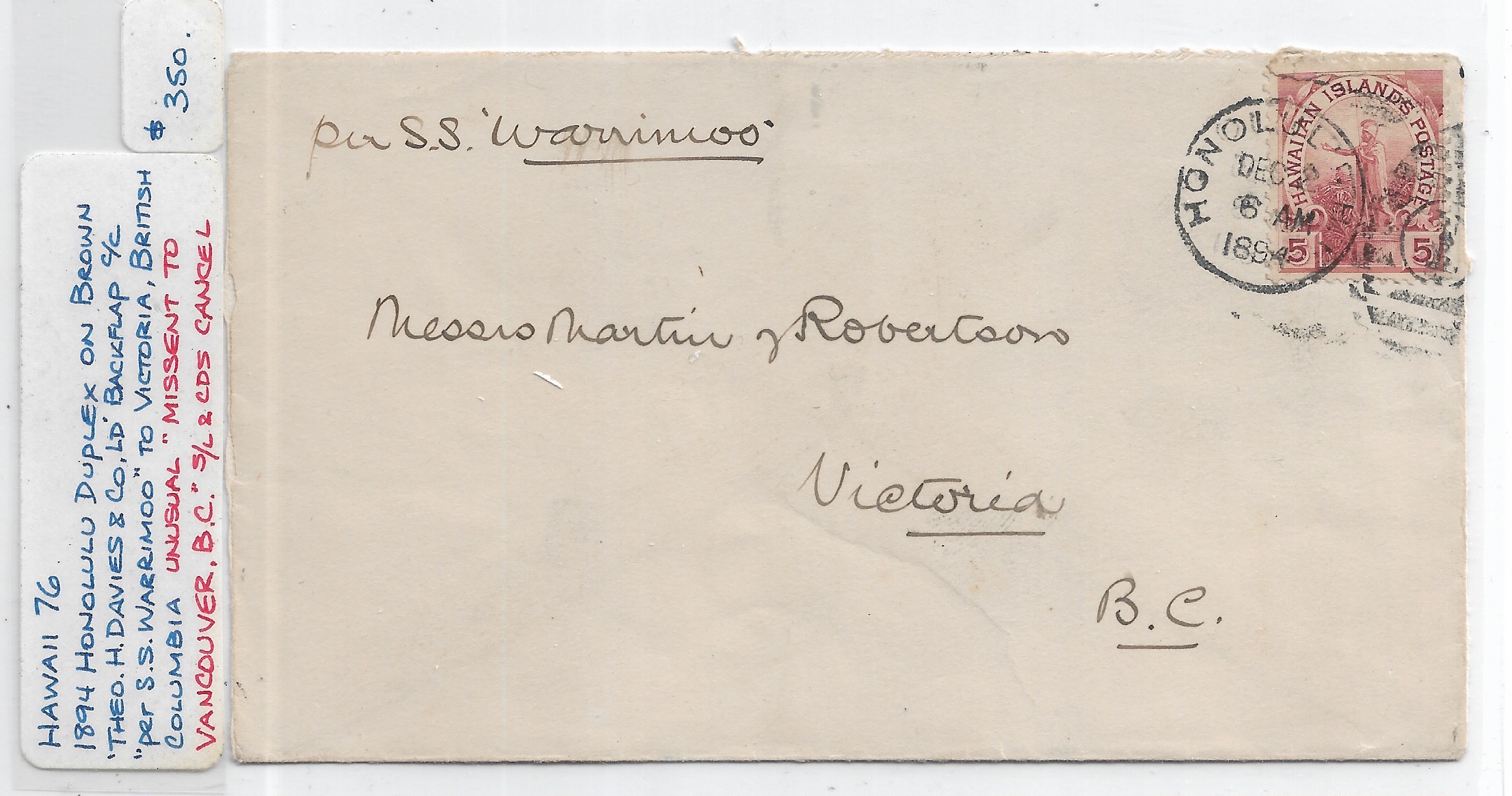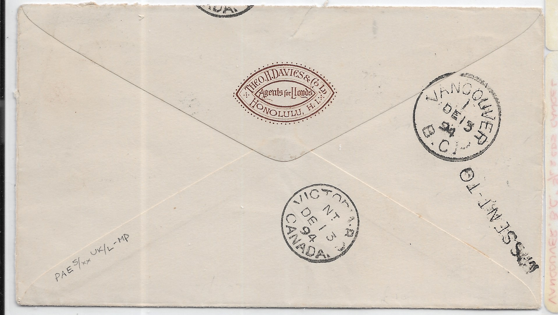 1894 Honolulu, Hawaii to Victoria, BC, Canada. back stamped "Missent to Vancouver" & Victoria.