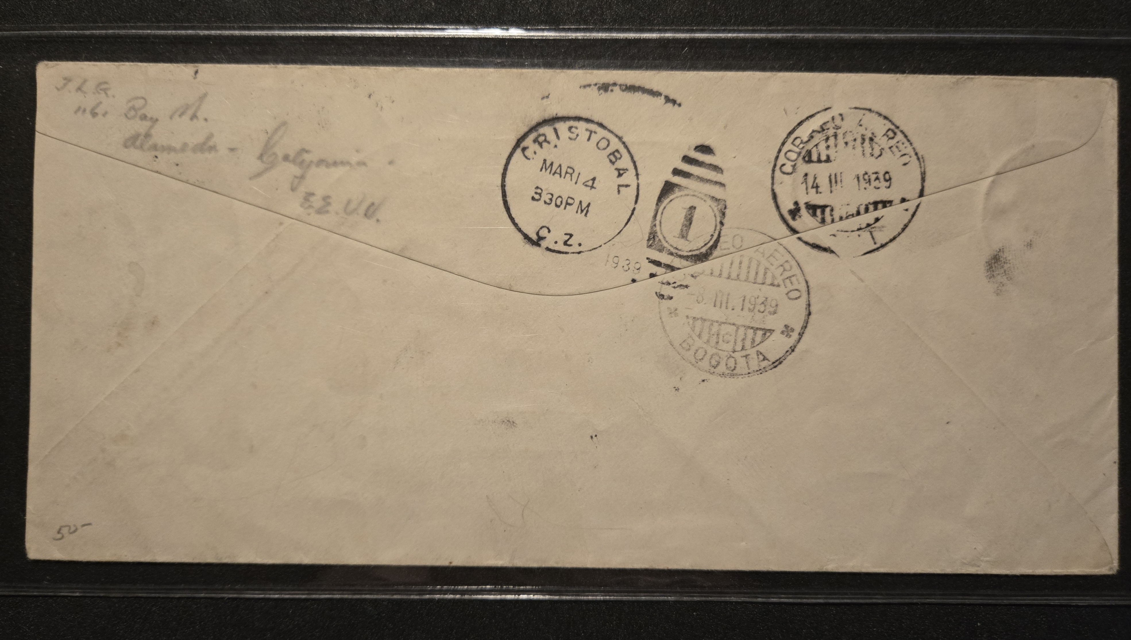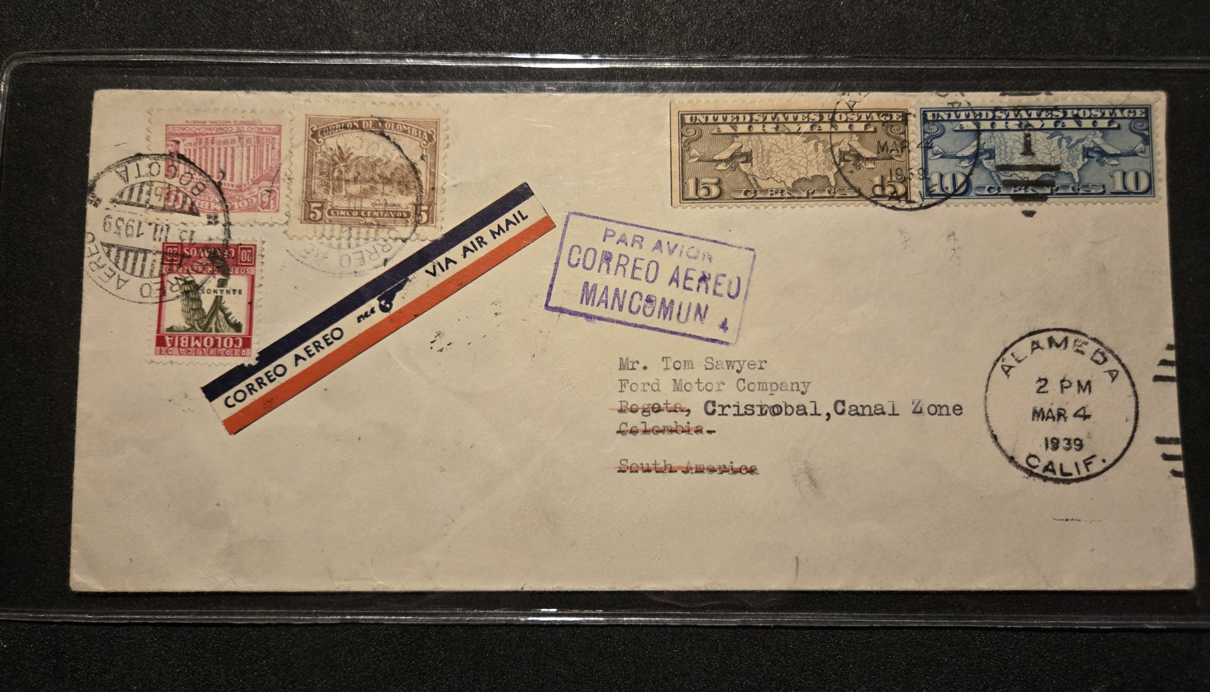 1939 Alameda, Ca to Bogota, Columbia Airmail remailed To Crist�bal, Canal Zone, Dual Postage. back stamped Bogota & Cristobal.