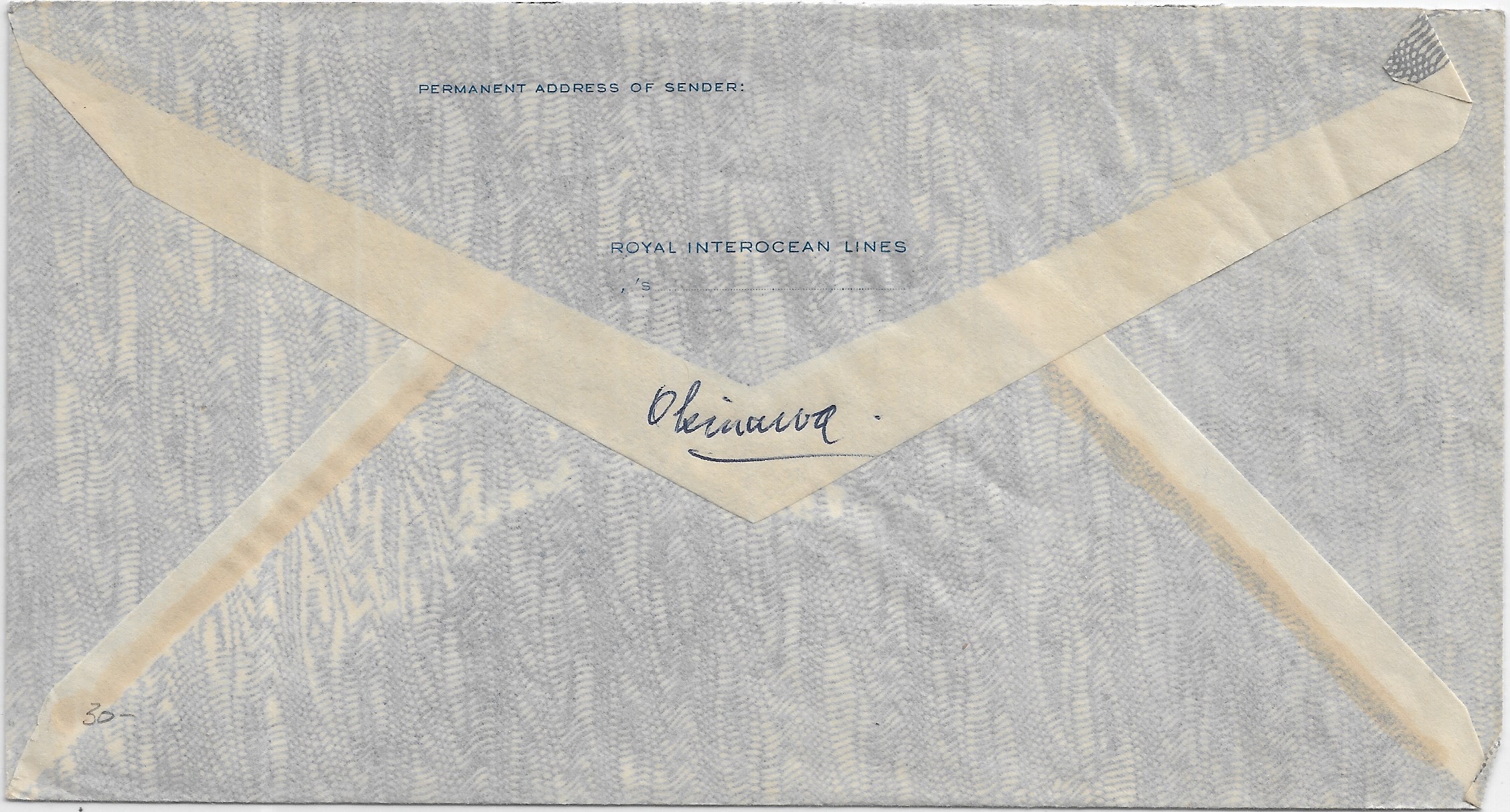 | 1932 Iloilo, PI to Copenhagen, Denmark via Singapore, KLM. back stamped Copenhagen. Cover has been folded. | Price: $25.00