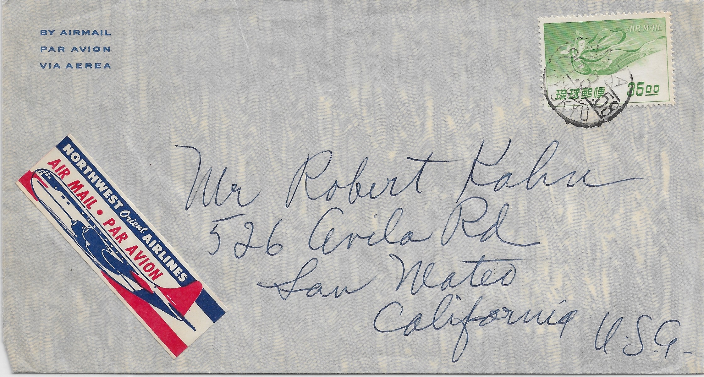 | 1958 Naha, Ryukyu Island to San Mateo, Ca Airmail. | Price: $25.00
