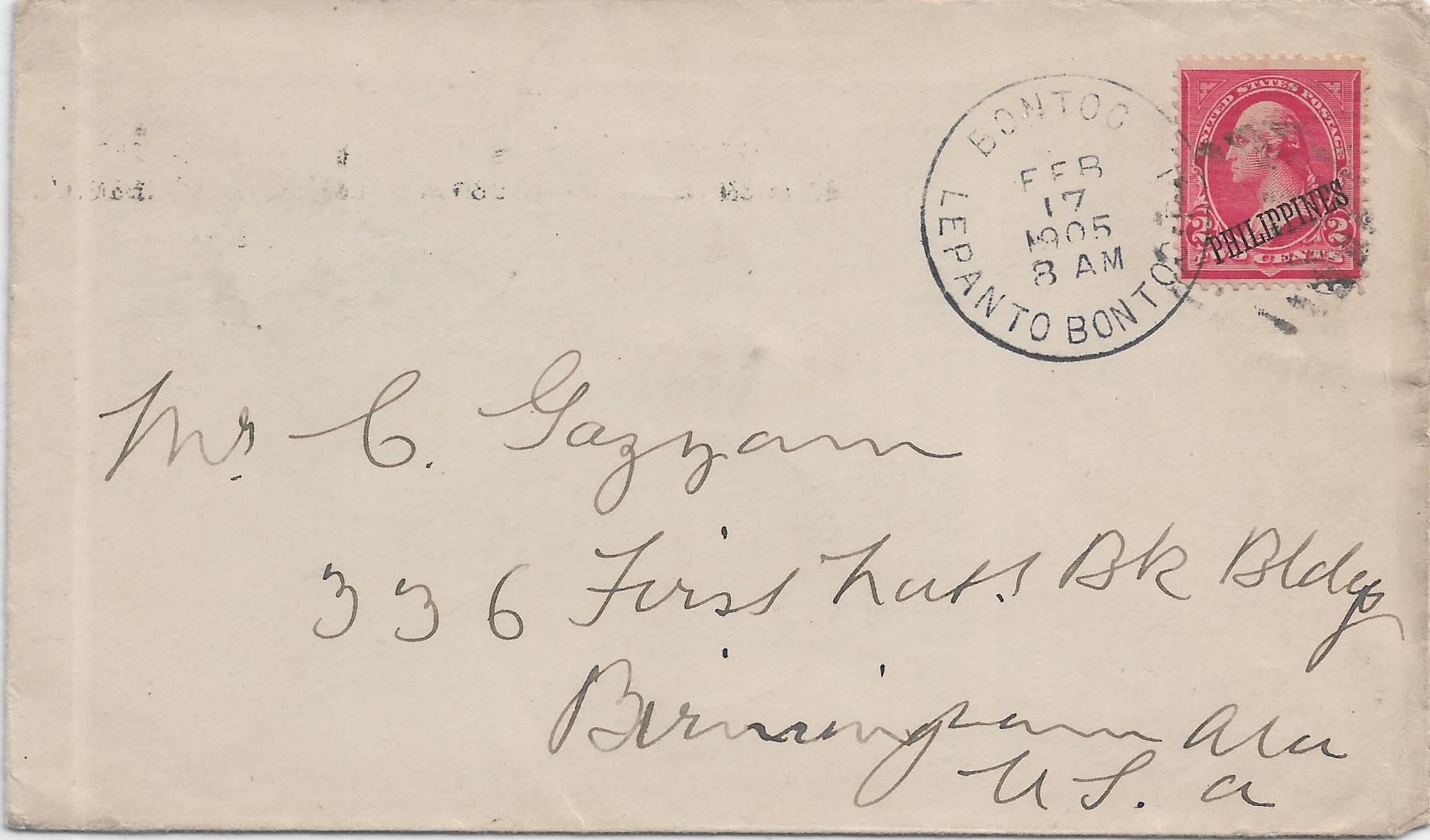| 1905 Bontog, Lepanto Bontog, Philippines to Birmingham, AL. back stamped Vigan, Cervantes, Manila, & Birmingham. | Price: $45.00
