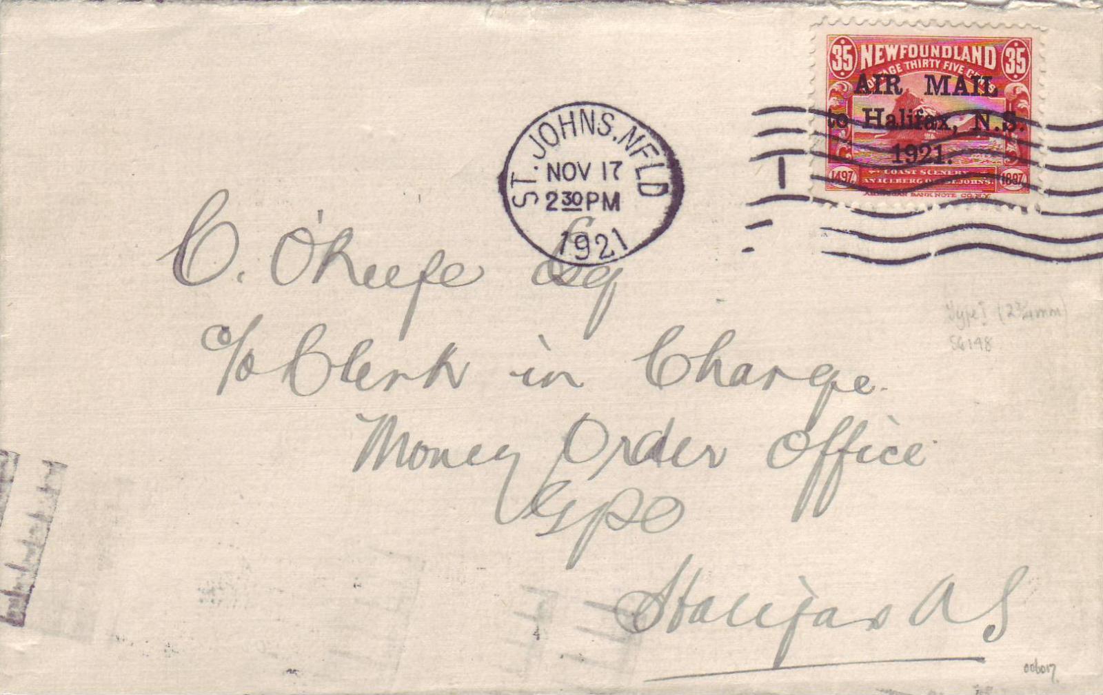 St John's Newfoundland to Halifax, Nova Scotia 1921 Airmail. Solo #C3b. Backstamped Halifax, NS.