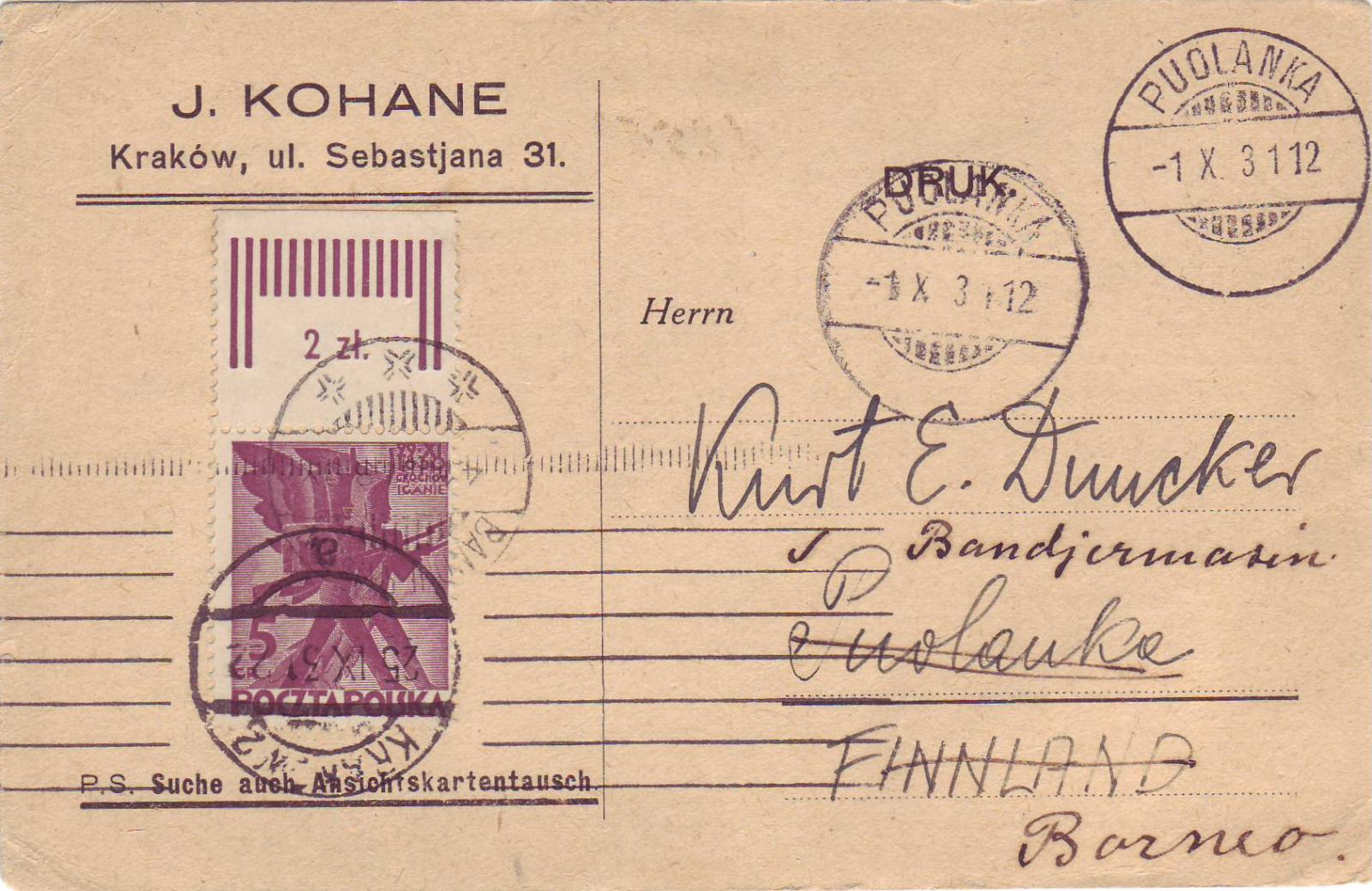 Krakow, Poland to Puolanka, Finland, 1931 Postal card fwd Bandjermasin, Borneo.