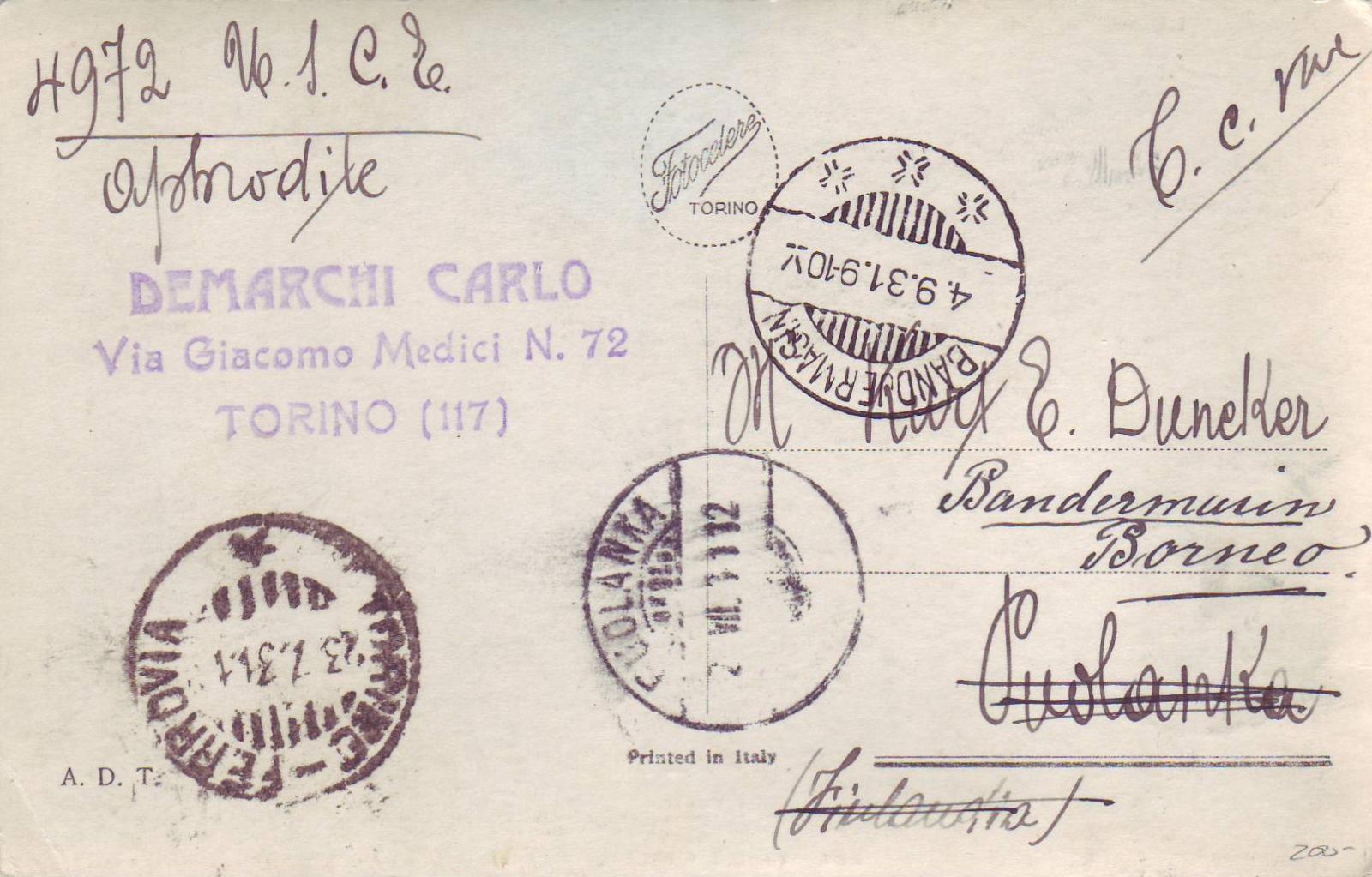 Torino, Italy to Puolanka, Finland, 1933 Post card fwd Bandjermasin, Borneo.