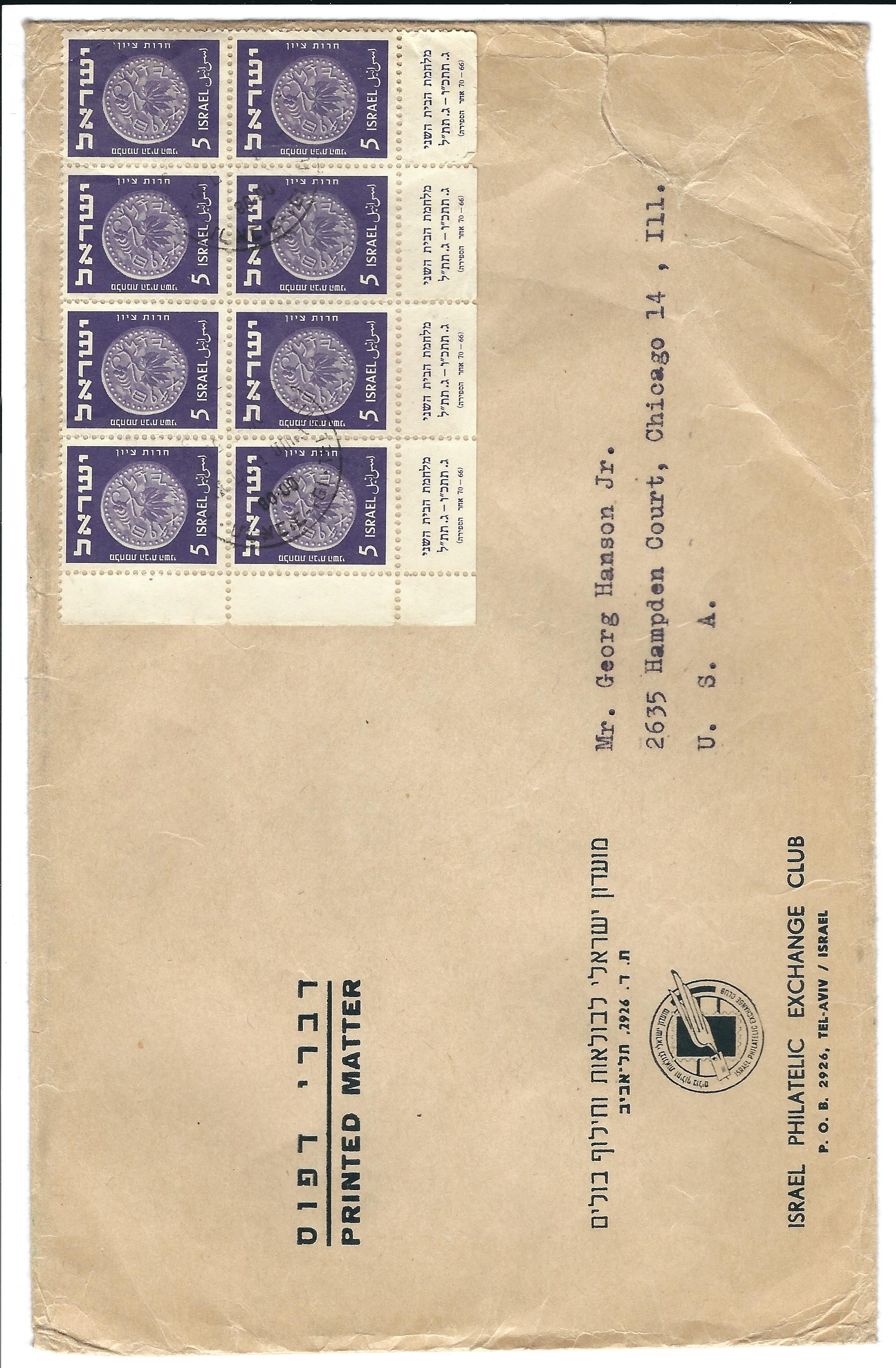 | Tel-Aviv, Israel to Chicago, ILL 1950 Printed Matter Rate. Sc #18 blk/8 w/Tabs. | Price: $25.00