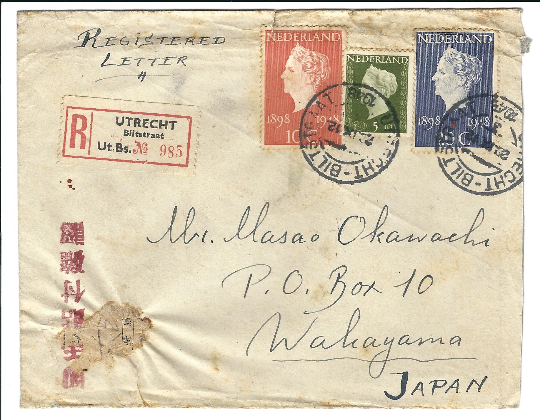 | Utrecht, Netherlands to Wakayama, Japan 1948 Registered. backstamped New York & San Francisco. | Price: $15.00