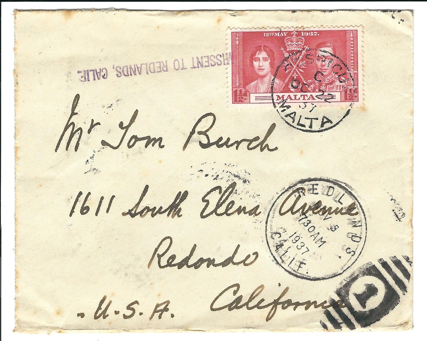 | Malta to Redondo, Ca 1937 missent to Redlands. backstamped Redondo. | Price: $10.00