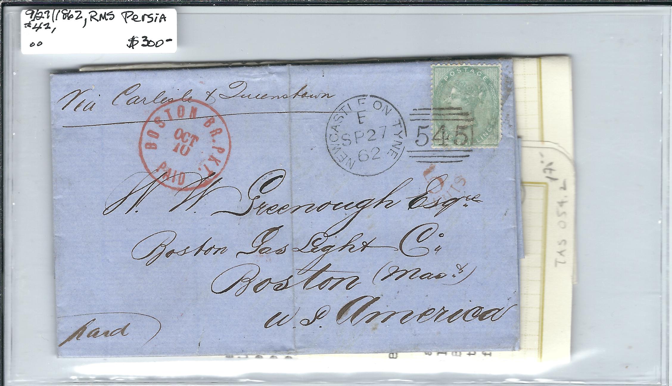 | Newcastle on Tyne, England to Boston, Mass 1862 via Cunard Lines R.M.S. Persia. Nice markings and exhibit piece. Stamp is Scott #28. | Price: $300.00