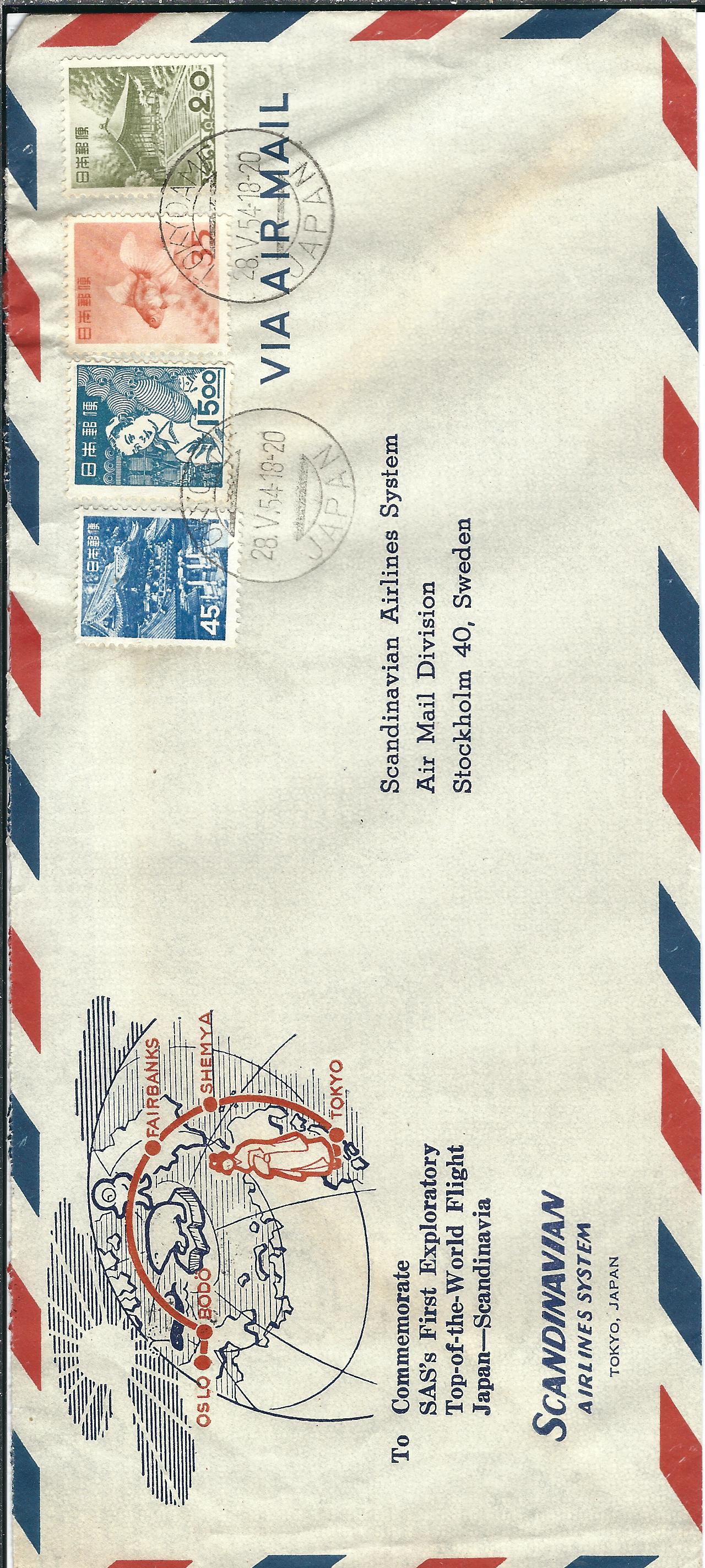 | Tokyo, Japan to Stockholm, Sweden 1954 1st Exploratory Top-of-the-World Flight, Scandinavian Airlines. #10 back stamps Stockholm. | Price: $25.00