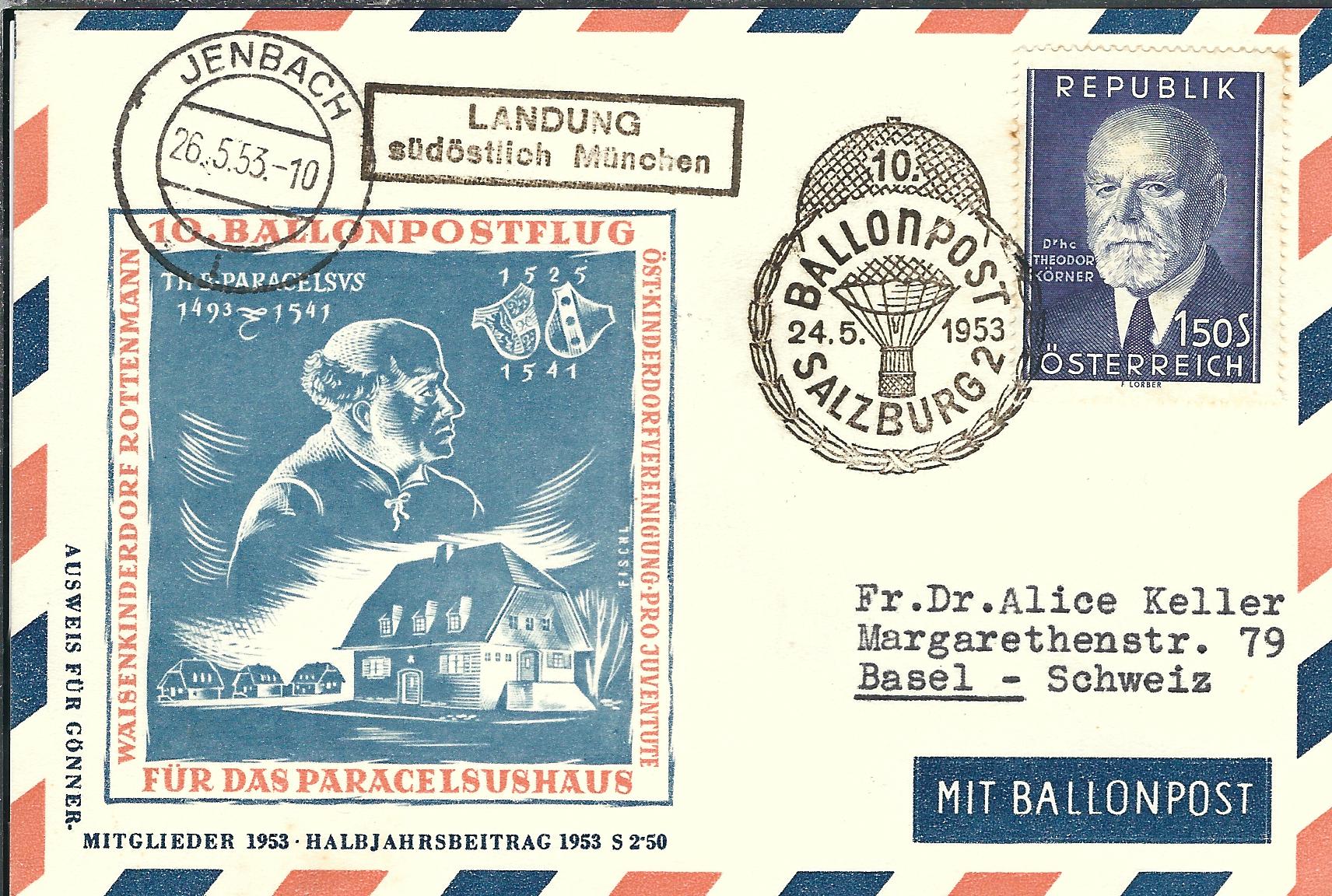 Salzburg to Basel, Switzerland 1953 Balloonpost.