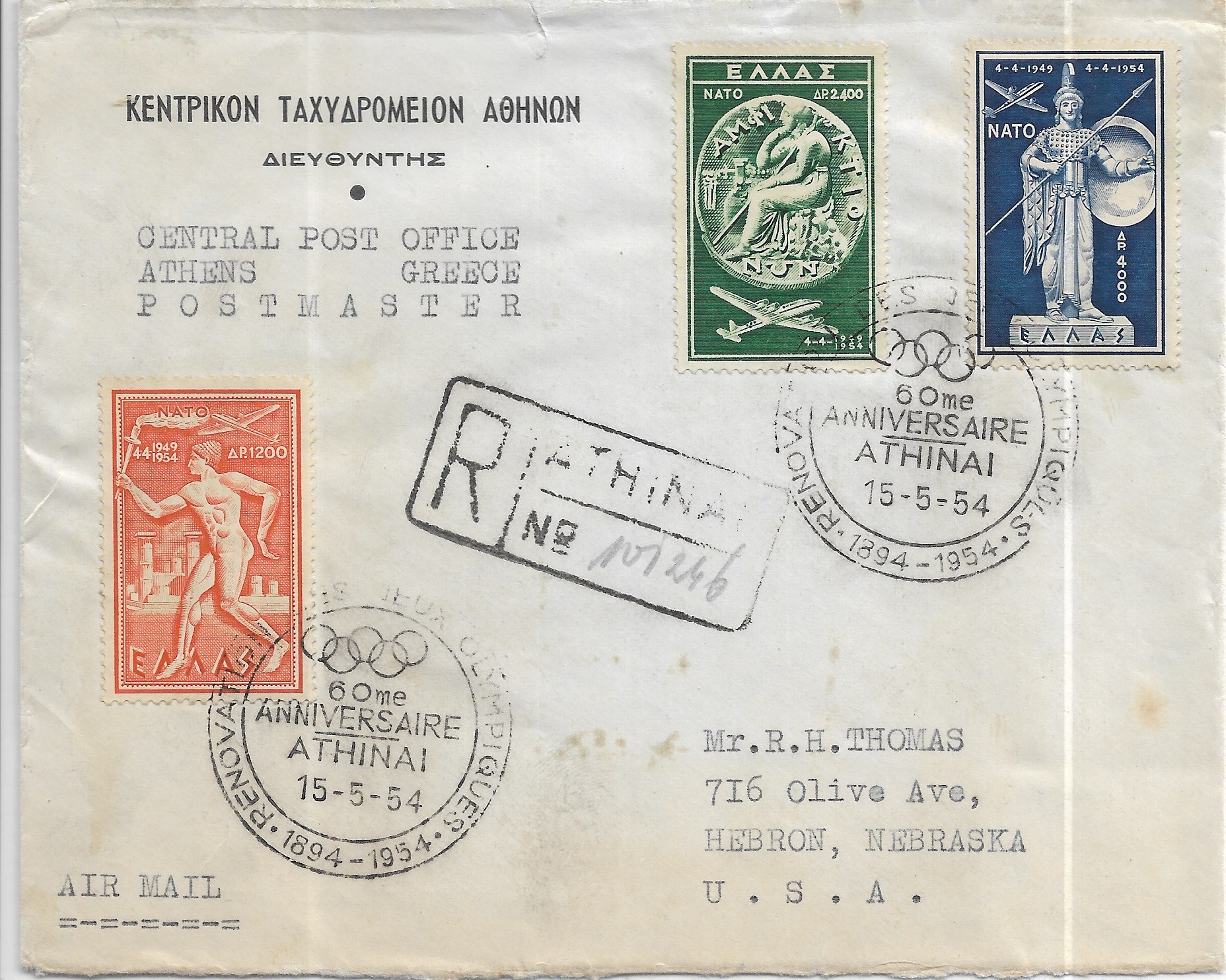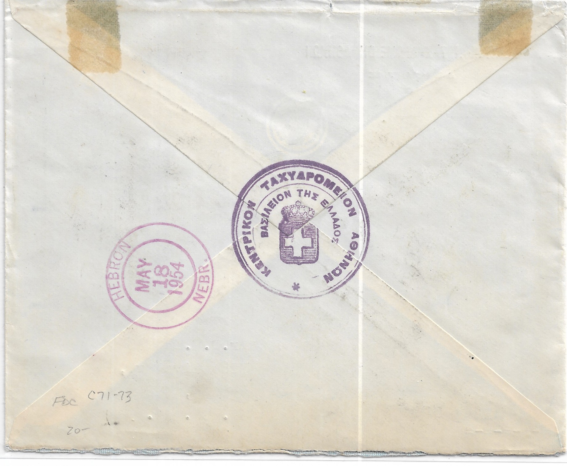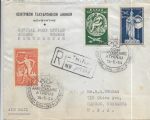 1953 Athens, Greece to Hebron, Ne Registered Airmail FDC Scott # C71-C73. back stamped Hebron.