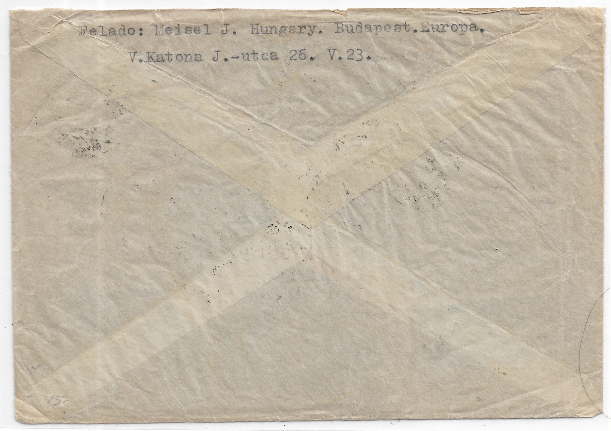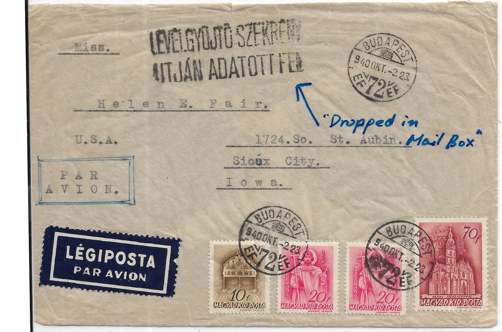 1940 Budapest, HUngary to Sioux Falls, IA Airmail "Dropped in the Mail" handstamp.
