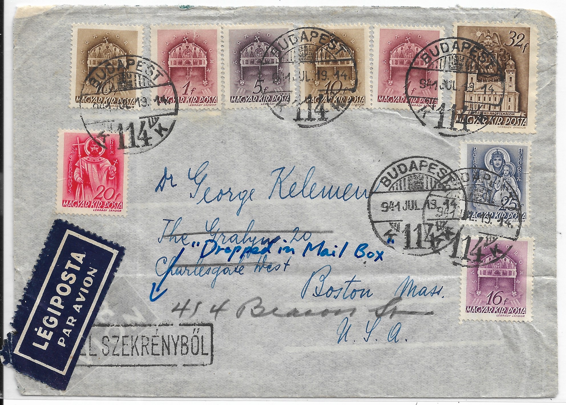 1941 Budapest, Hungary to Boston, Ma Airmail "Dropped in the Mail" handstamp.