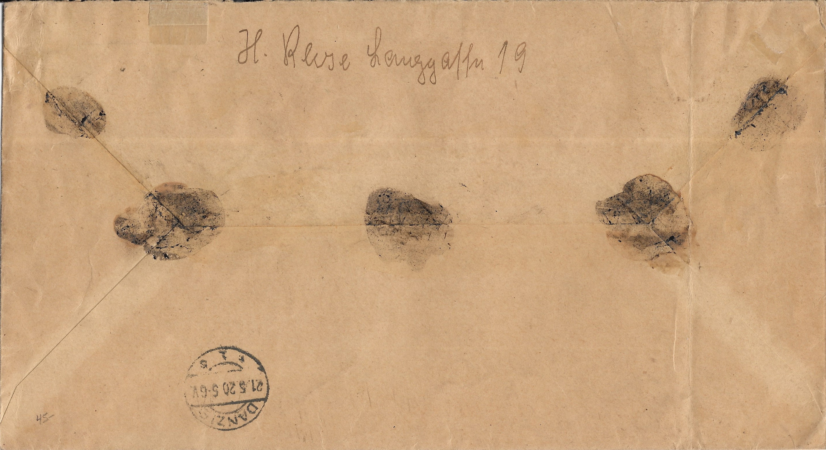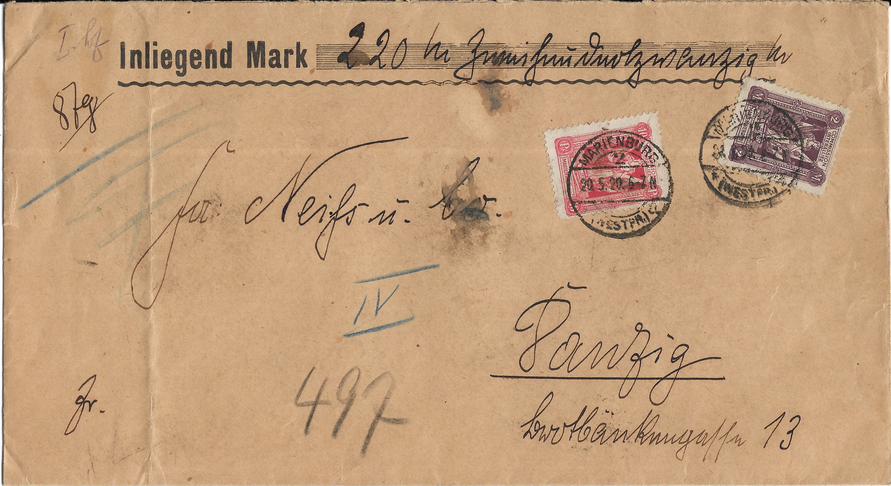 1920 Marienburg, Germany to Danzig. back stamped Danzig. large envelope.
