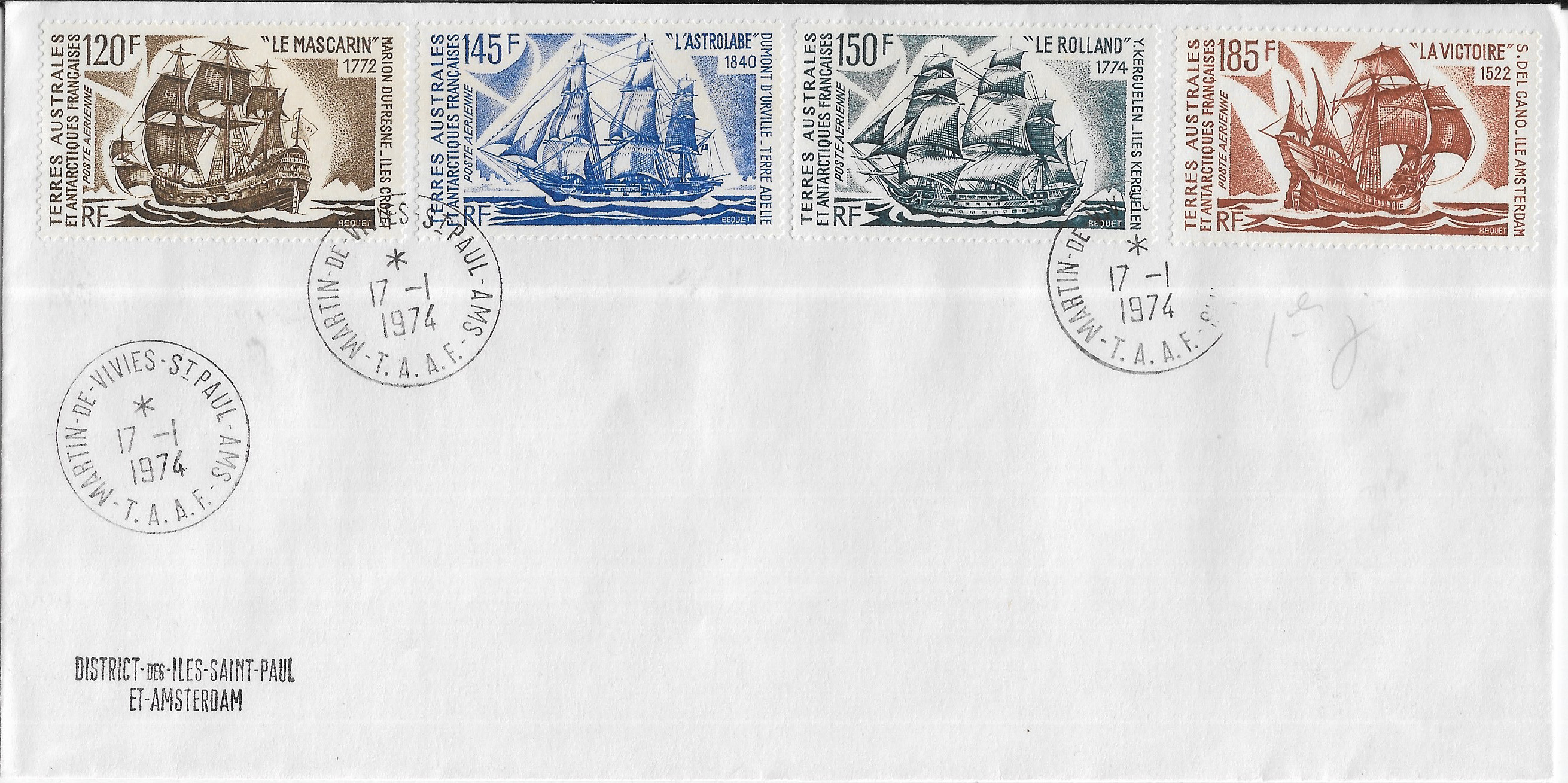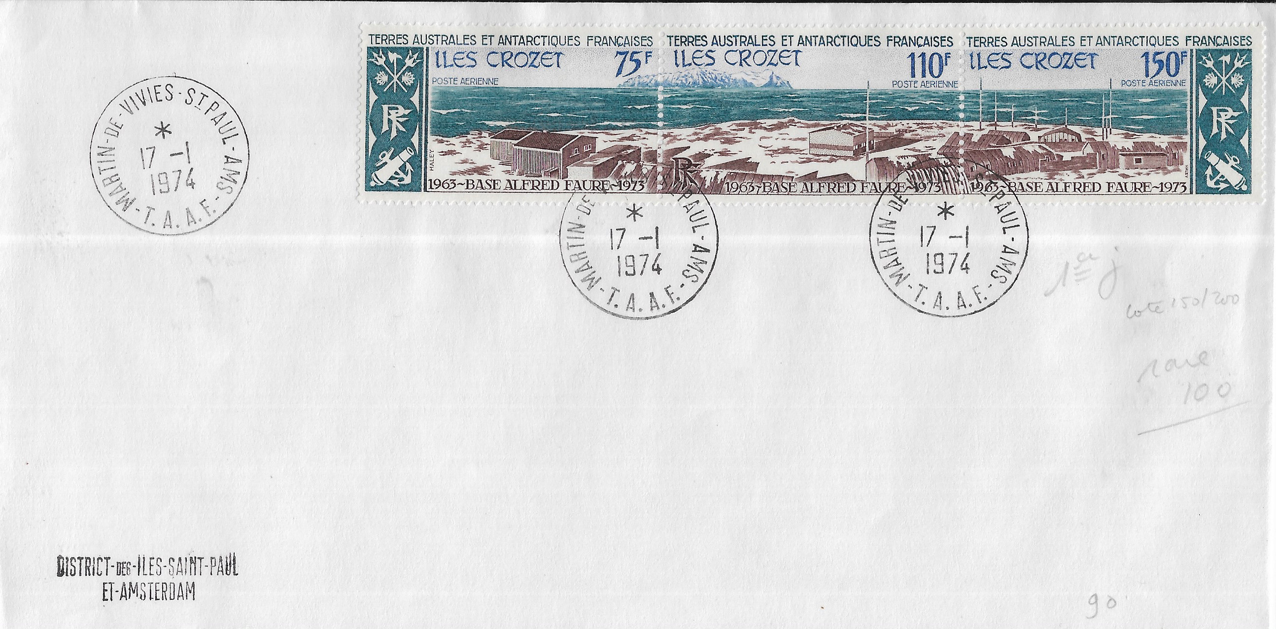 1975 Alfred-Faure, Crozet, French Southern & Antarctic Territory to Reunion Registered. back stamped Reunion.