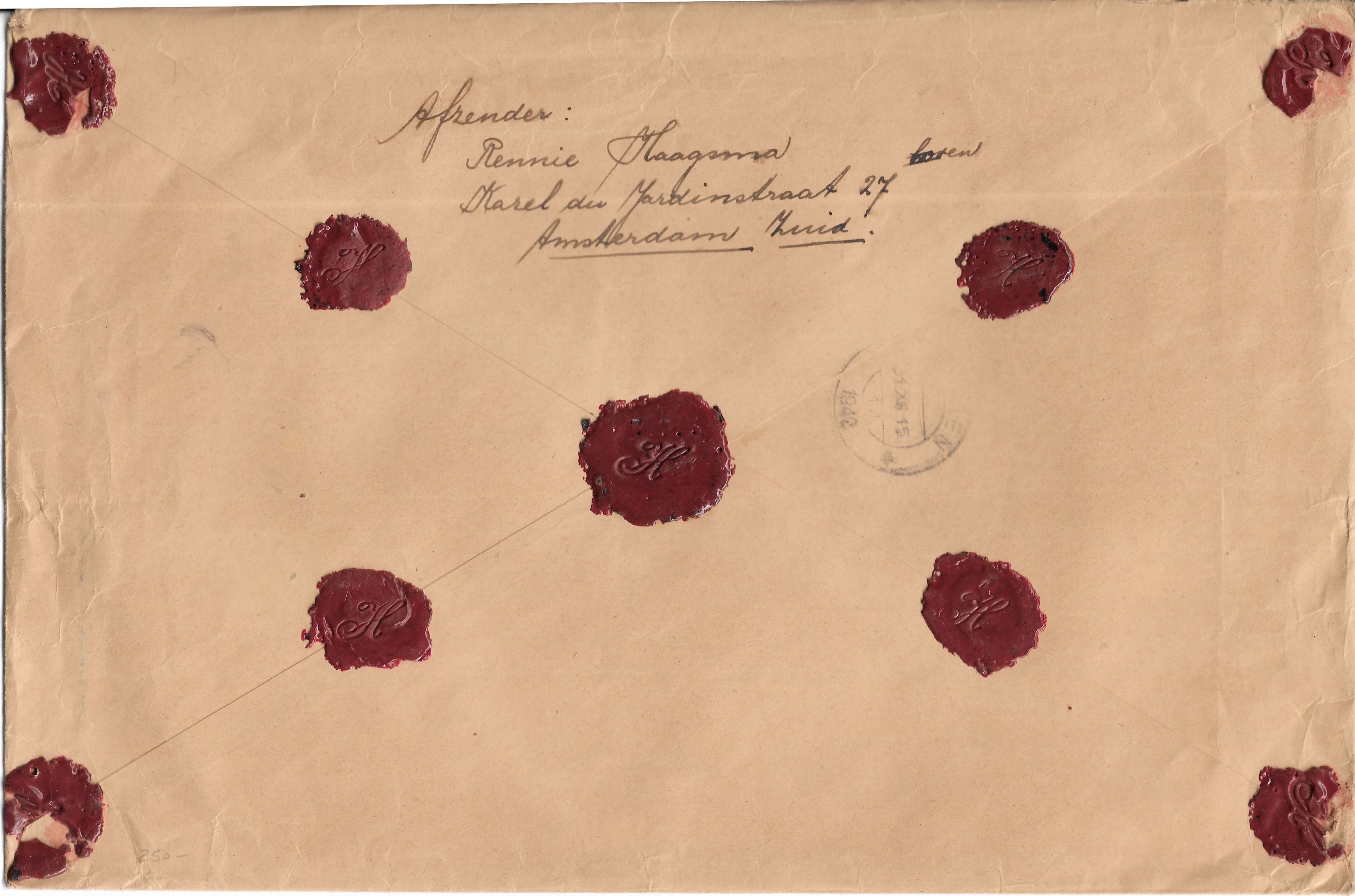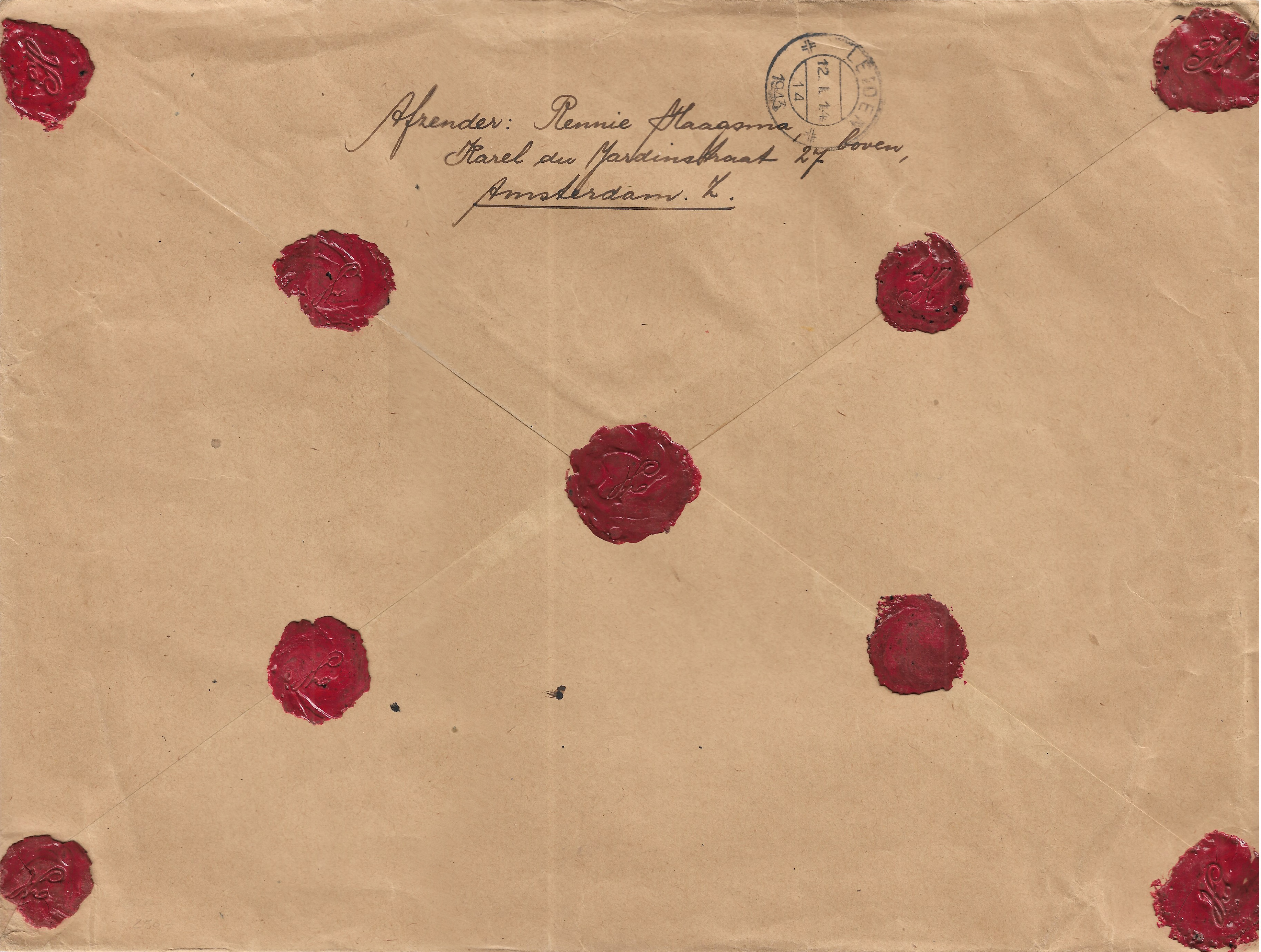 1942 Amsterdam to Leiden, Netherlands Registered (Legion Stamps). back stamped Leiden.