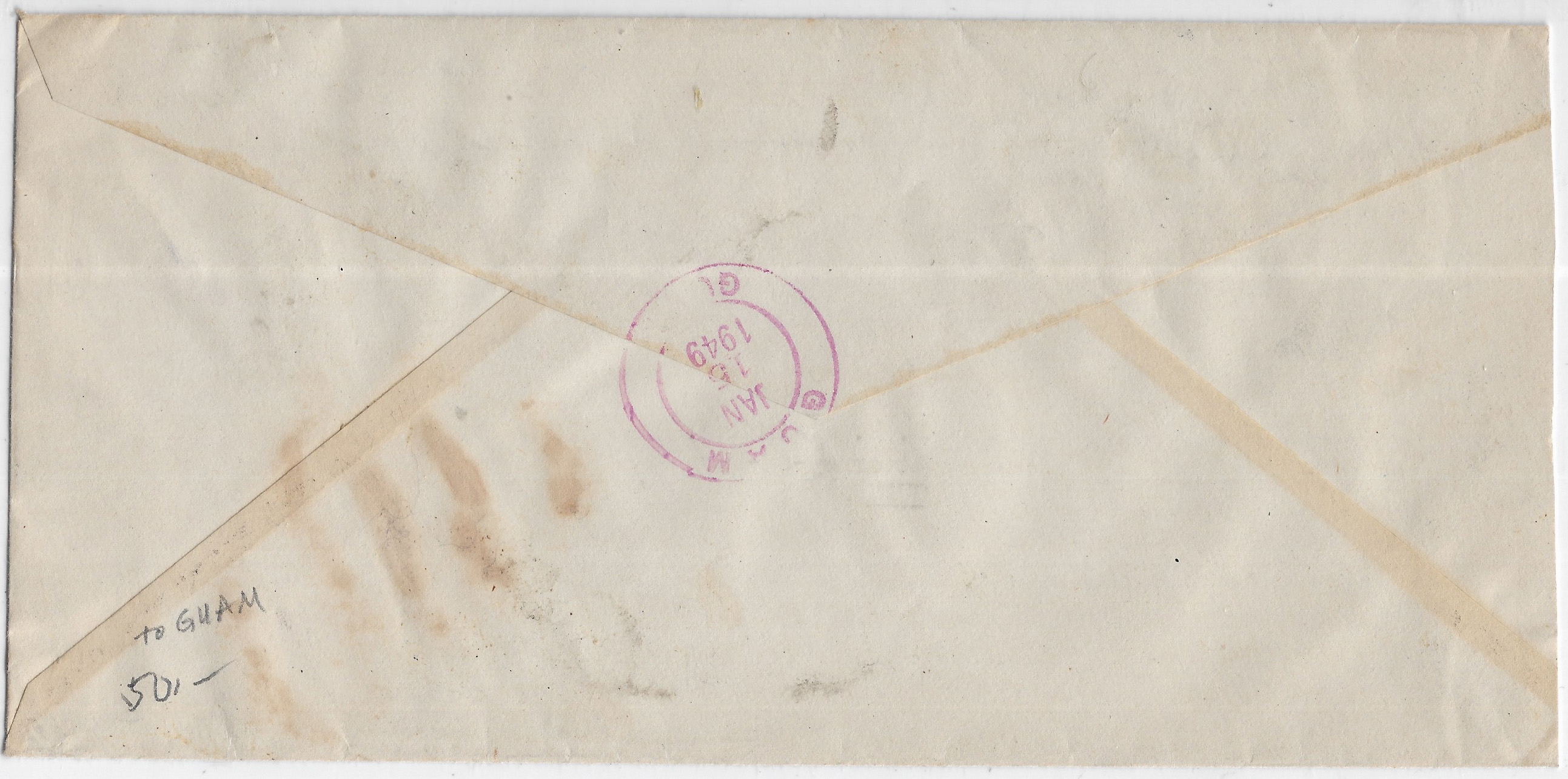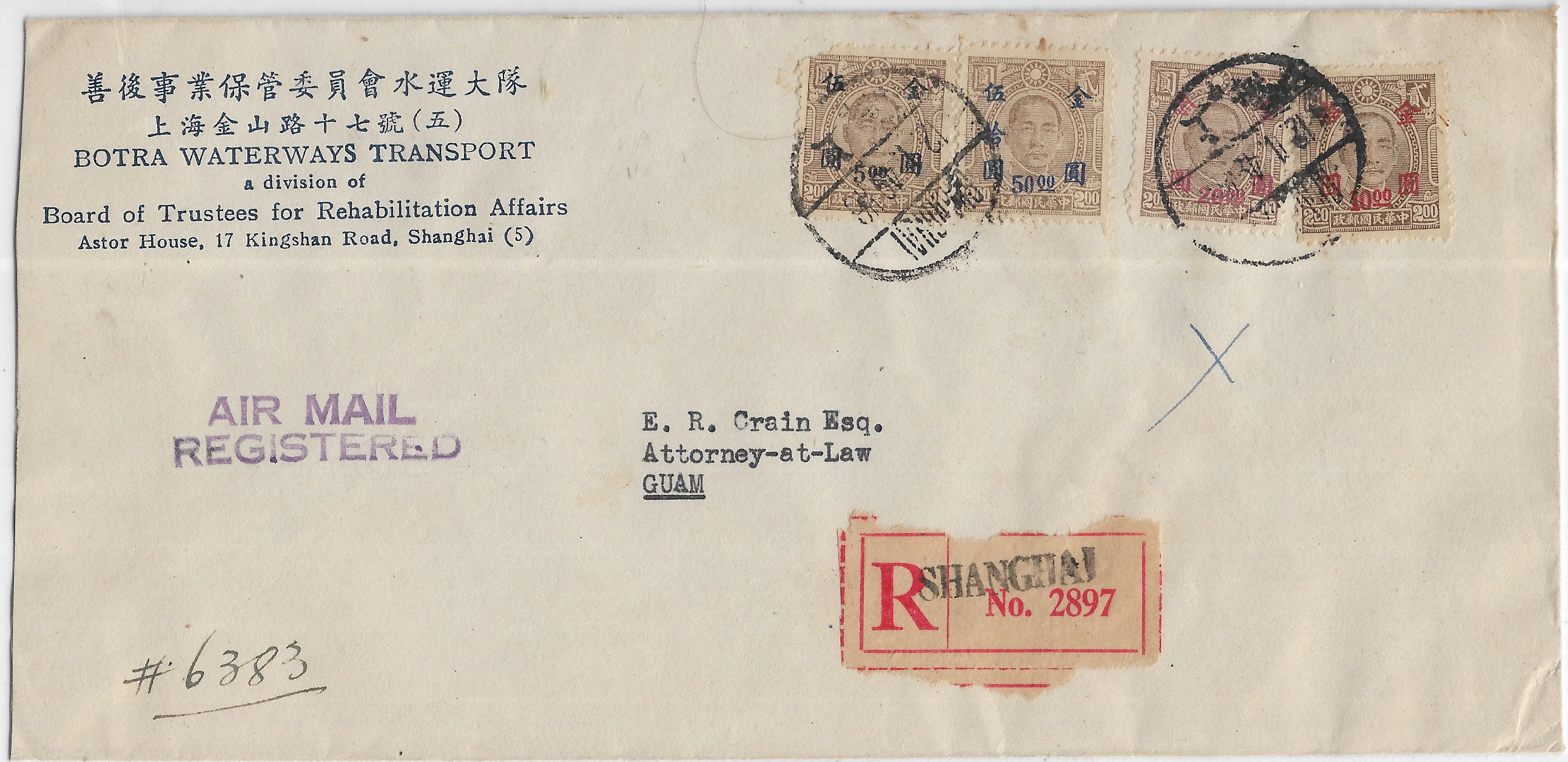 1949 Shanghai, China to Guam Registered Airmail. back stamped Guam.
