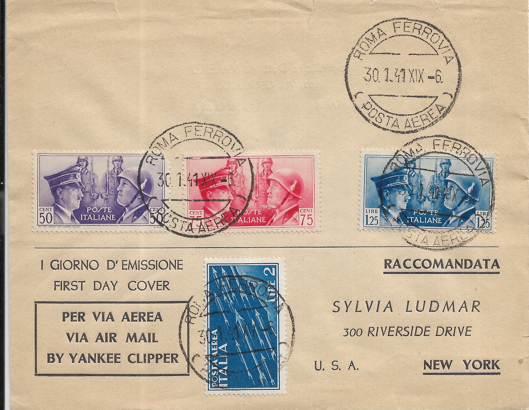 1941 Roma, Italy to New York, NY FDC via Yankee Clipper.
