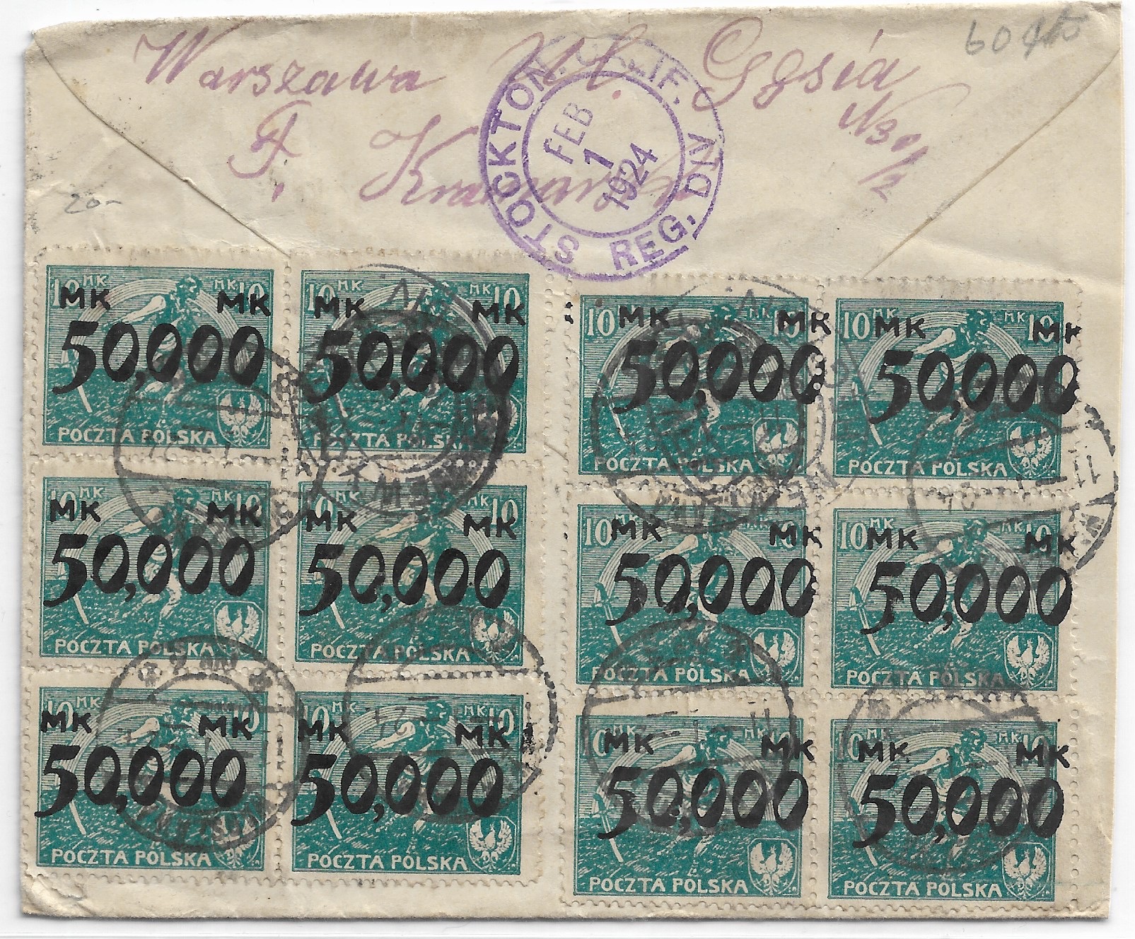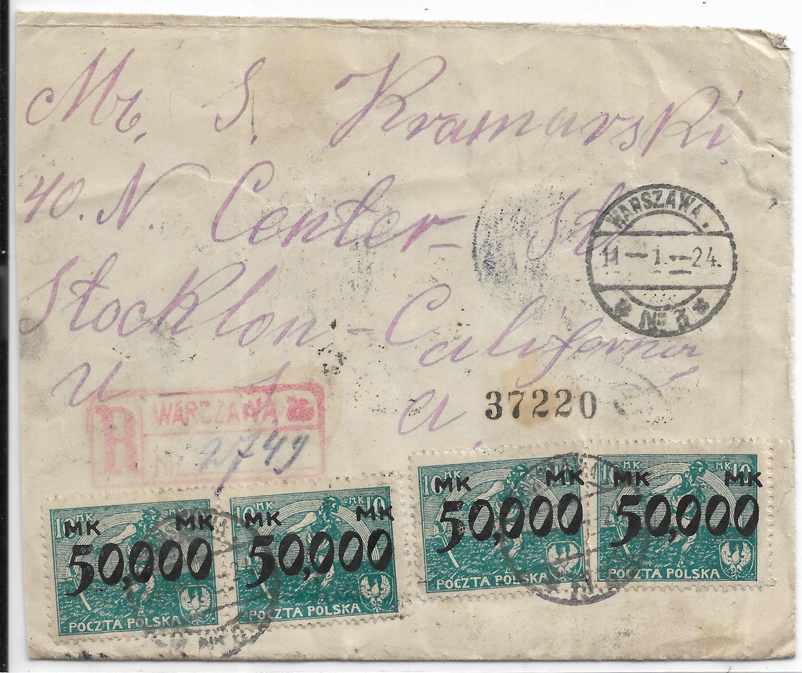 1924 Warsaw, Poland to Stockton, Ca Registered.