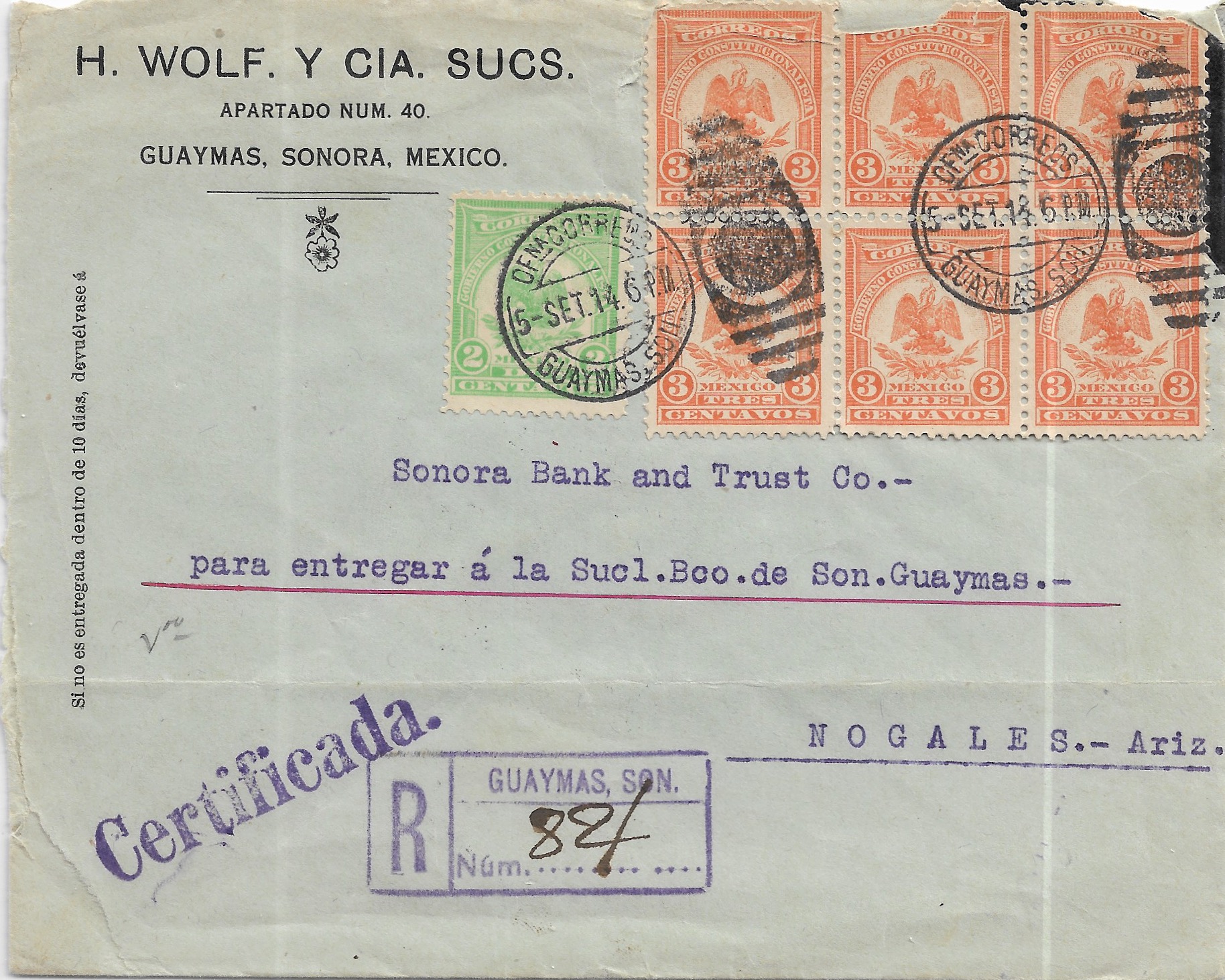 1914 Guaymas, Mexico to Nogales, AZ Registered.