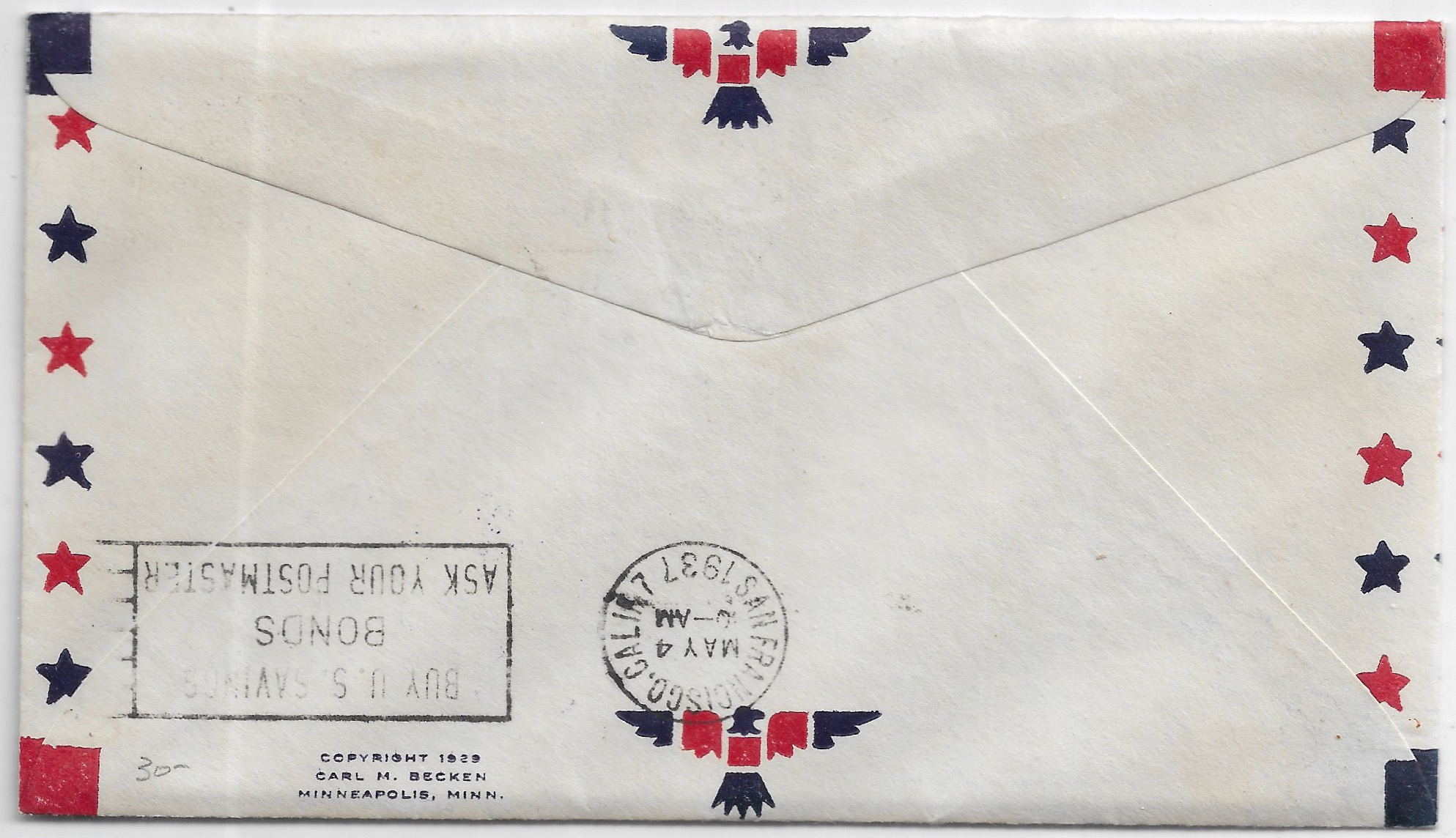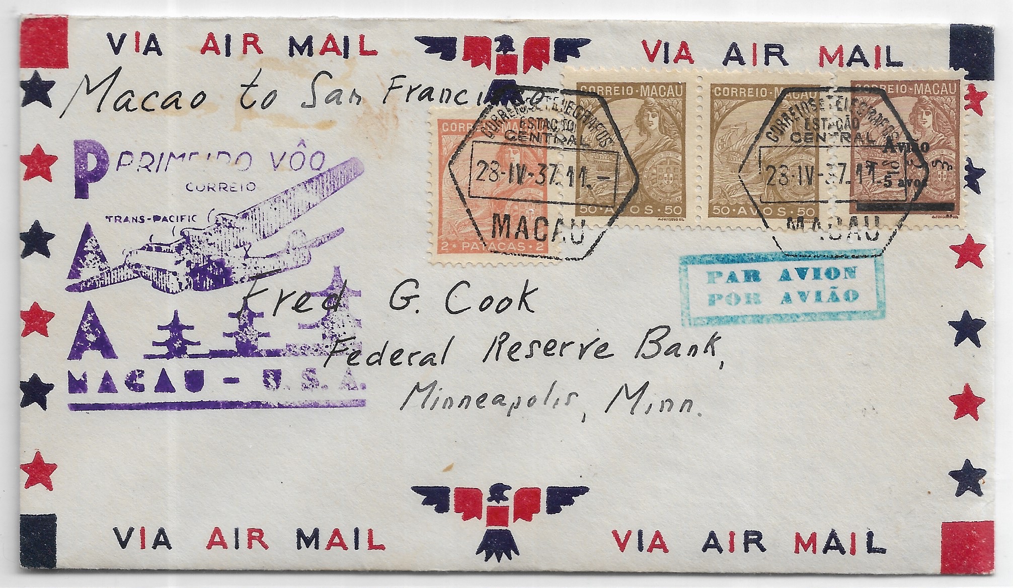 1937 1st Trans-Pacific Clipper Flight Macau to San Francisco, Ca onward Minneapolis, MN. back stamped San Francisco.