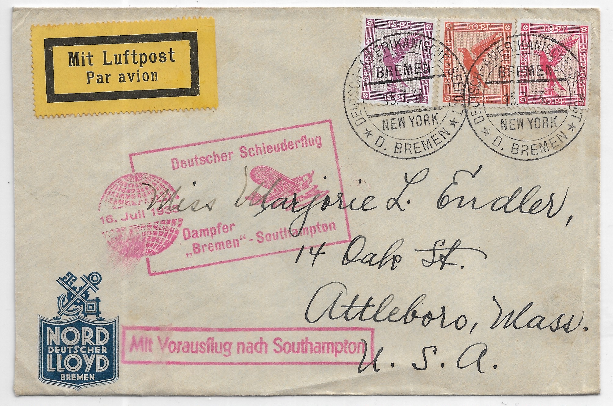 1933 Bremen, Germany to Attleboro, Ma Airmail SS Bremen Catapult mail.