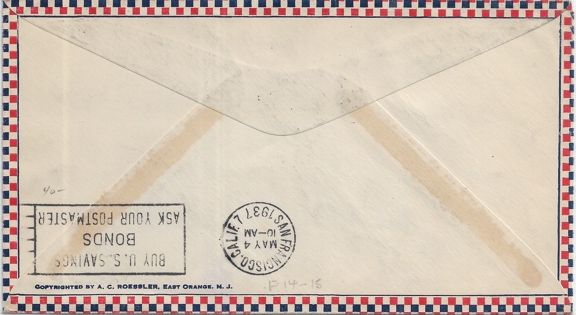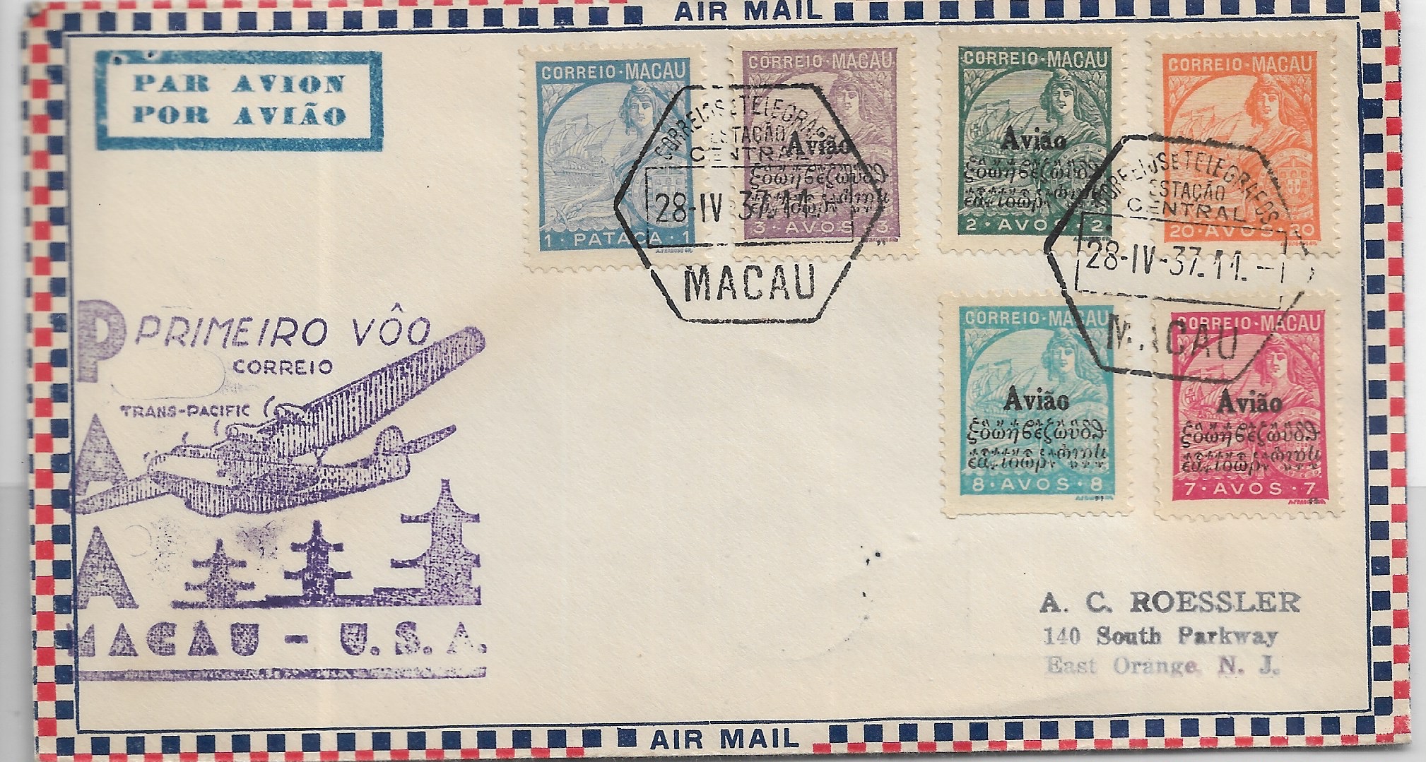 1937 1st Trans-Pacific Clipper Flight Macau to San Francisco, Ca onward East Orange, NJ. back stamped San Francisco.