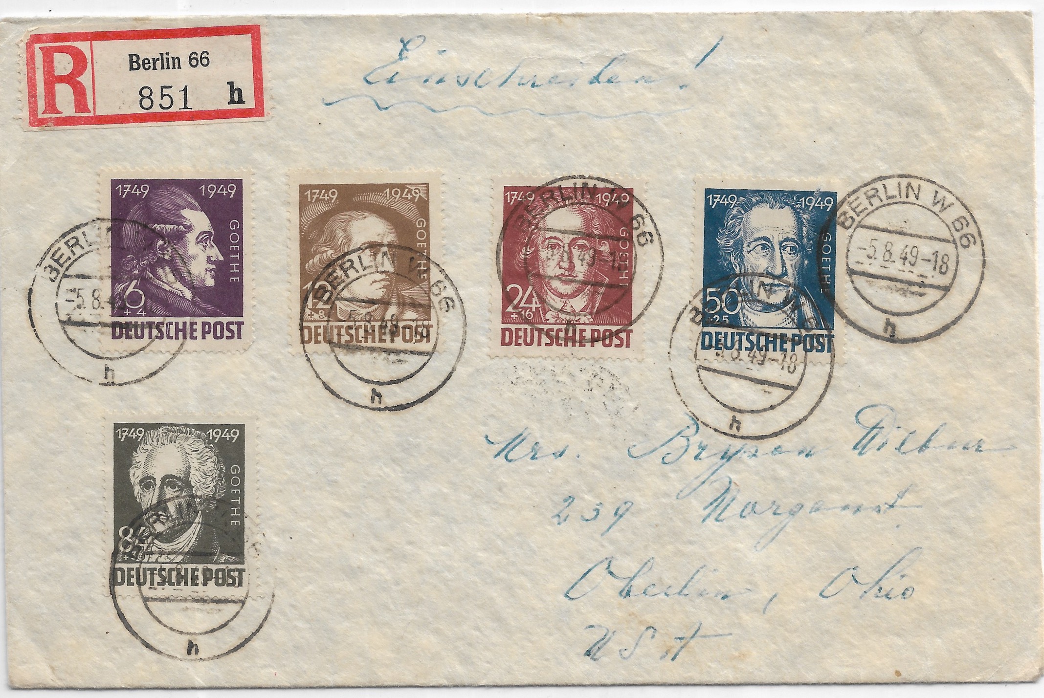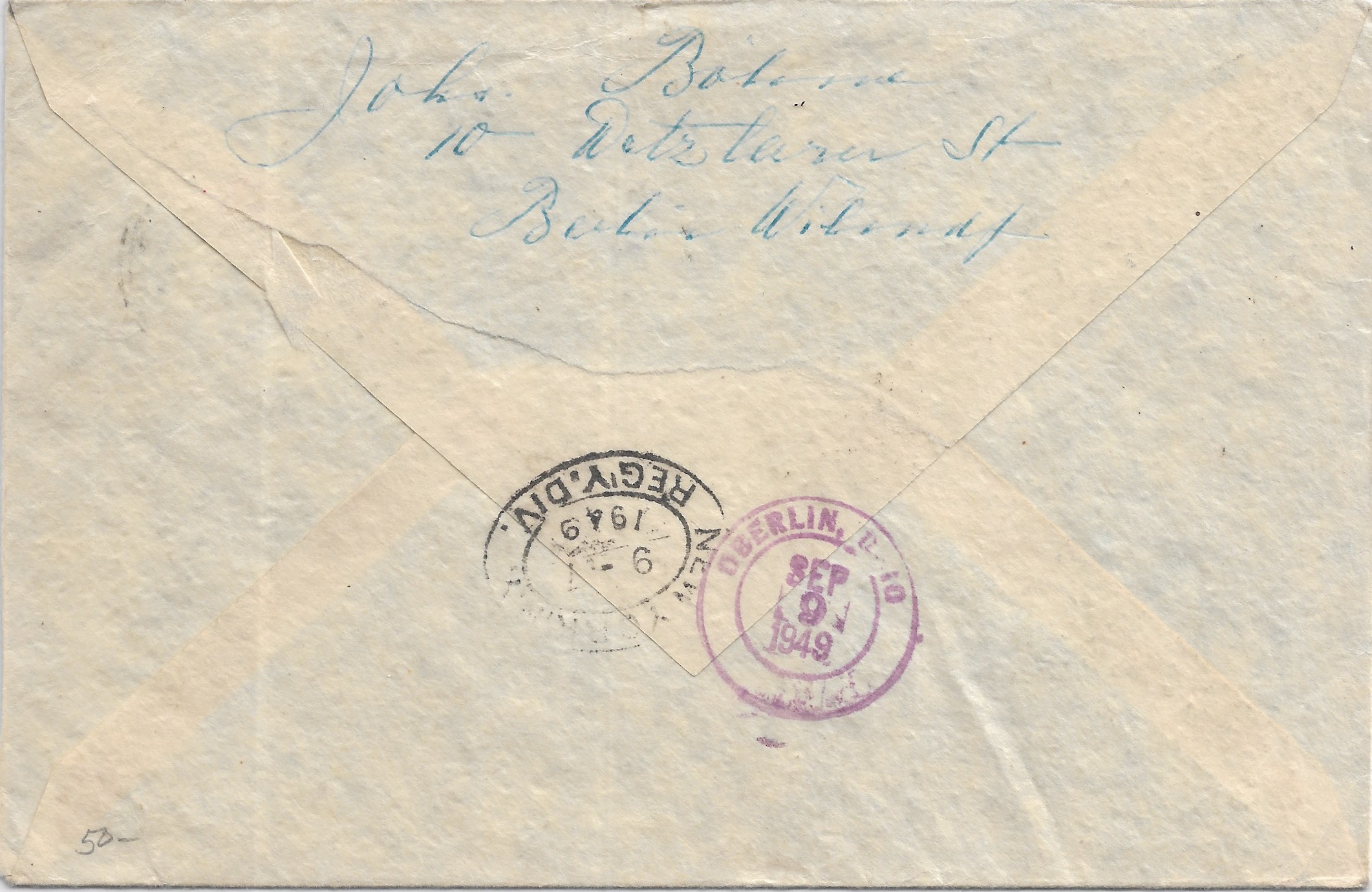1949 Berlin, Germany to Oberlin, OH Registered Semi-Postals. back stamped Berlin & Oberlin.