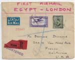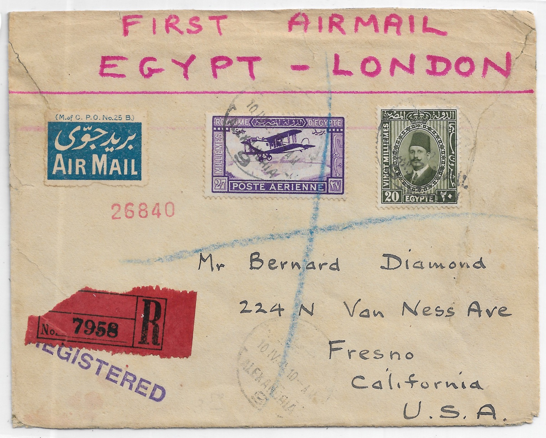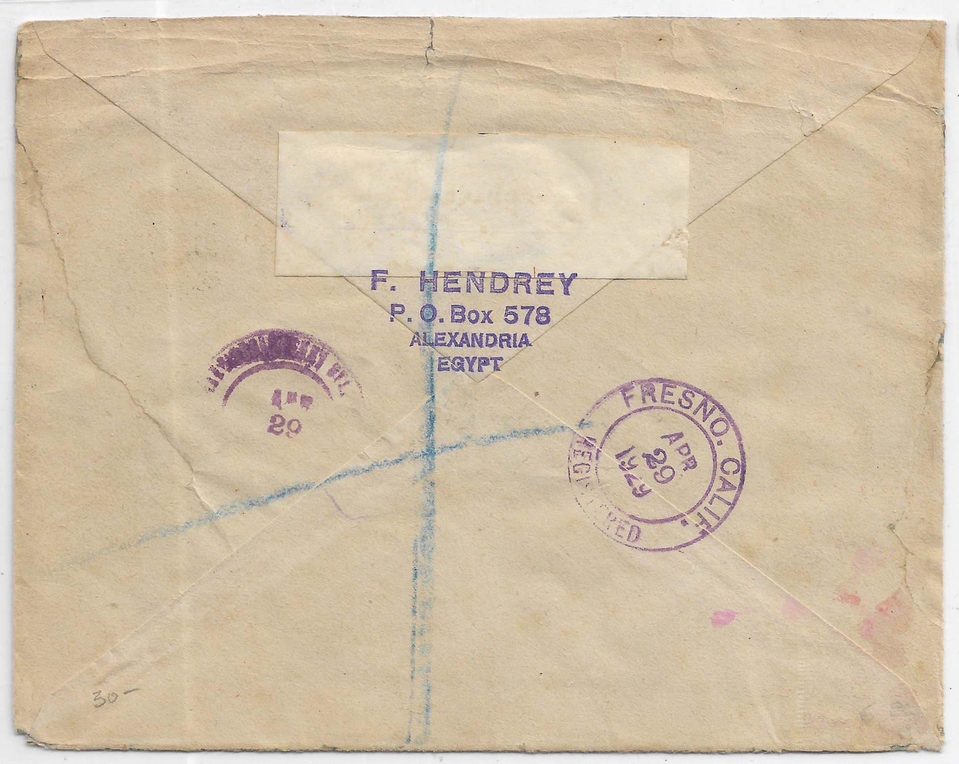 | 1929 Alexandria, Egypt to Fresno, Ca Registered 1st Flight Alexander to London, England. back stamped Fresno. | Price: $30.00