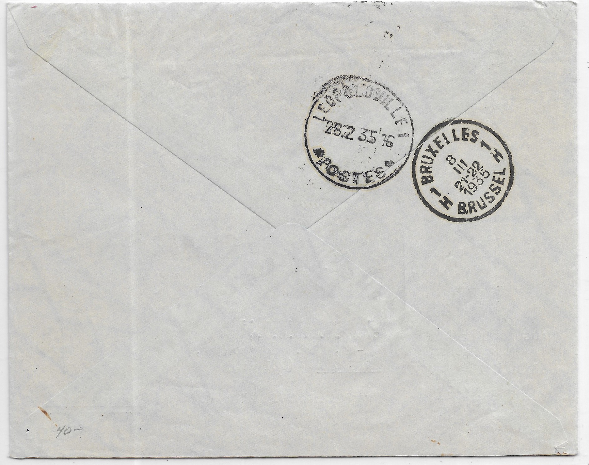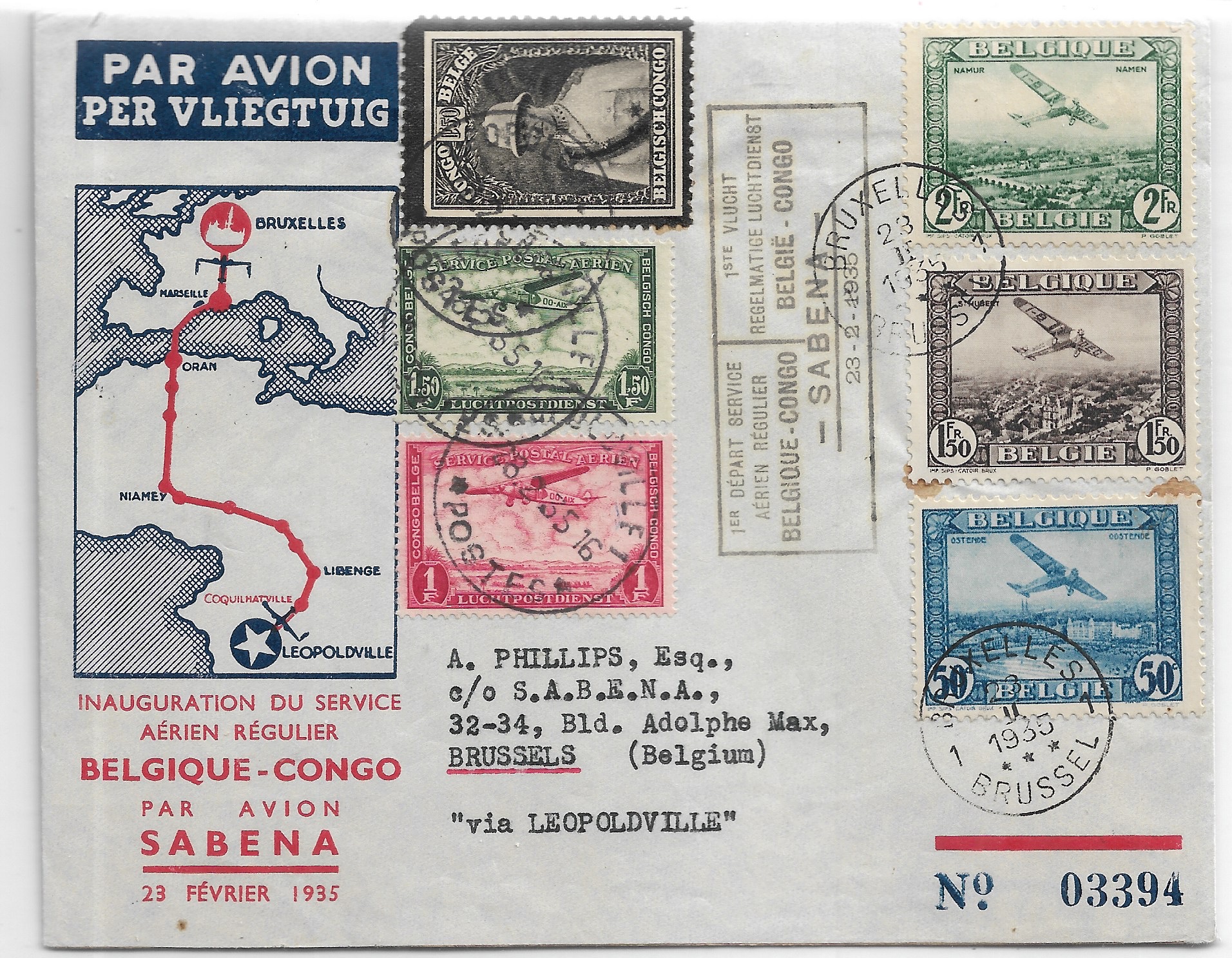 | 1935 Brussels, Belgium to Leopoldville Belgian Congo 1st Flight. back stamped Brussels & Leopoldville. | Price: $40.00