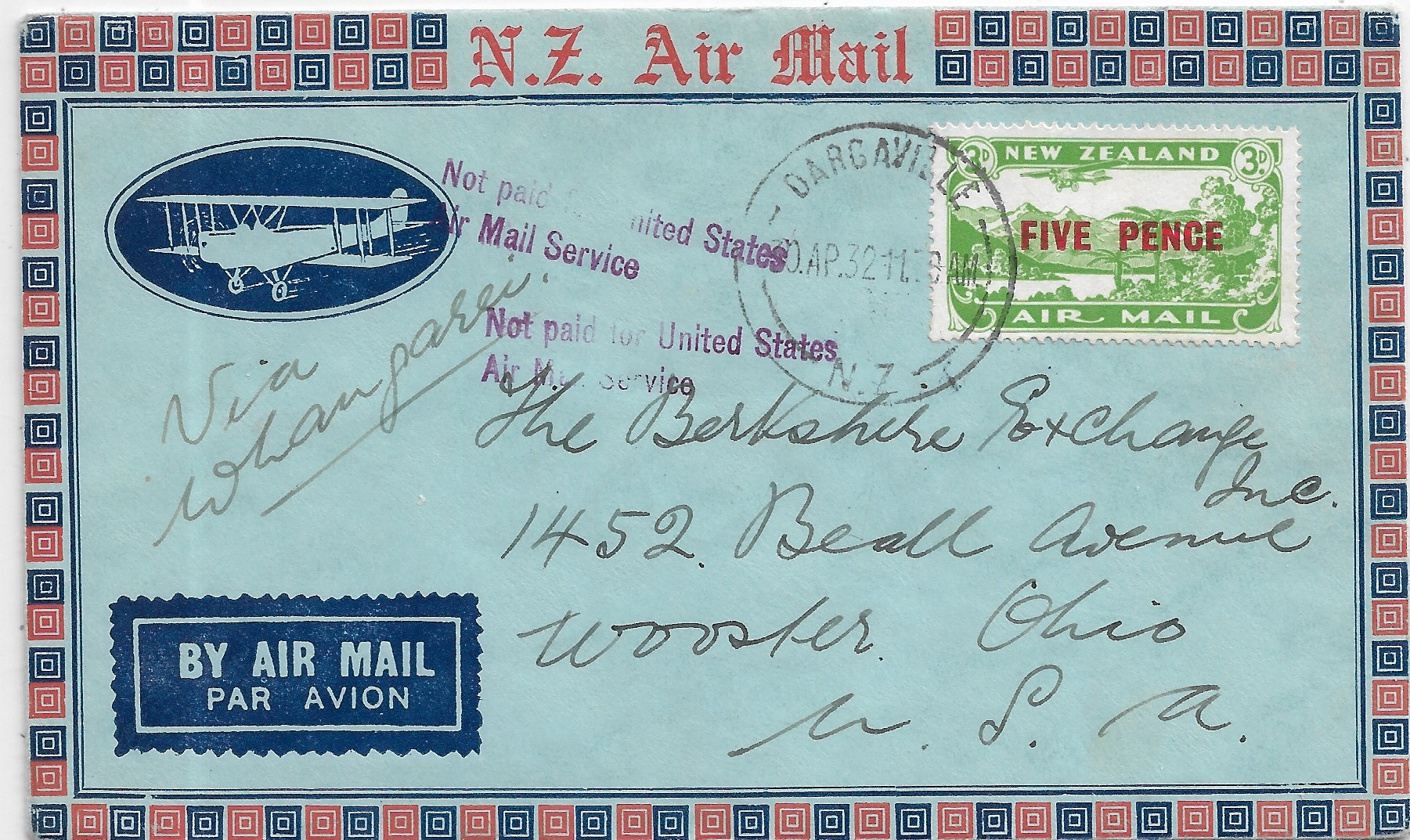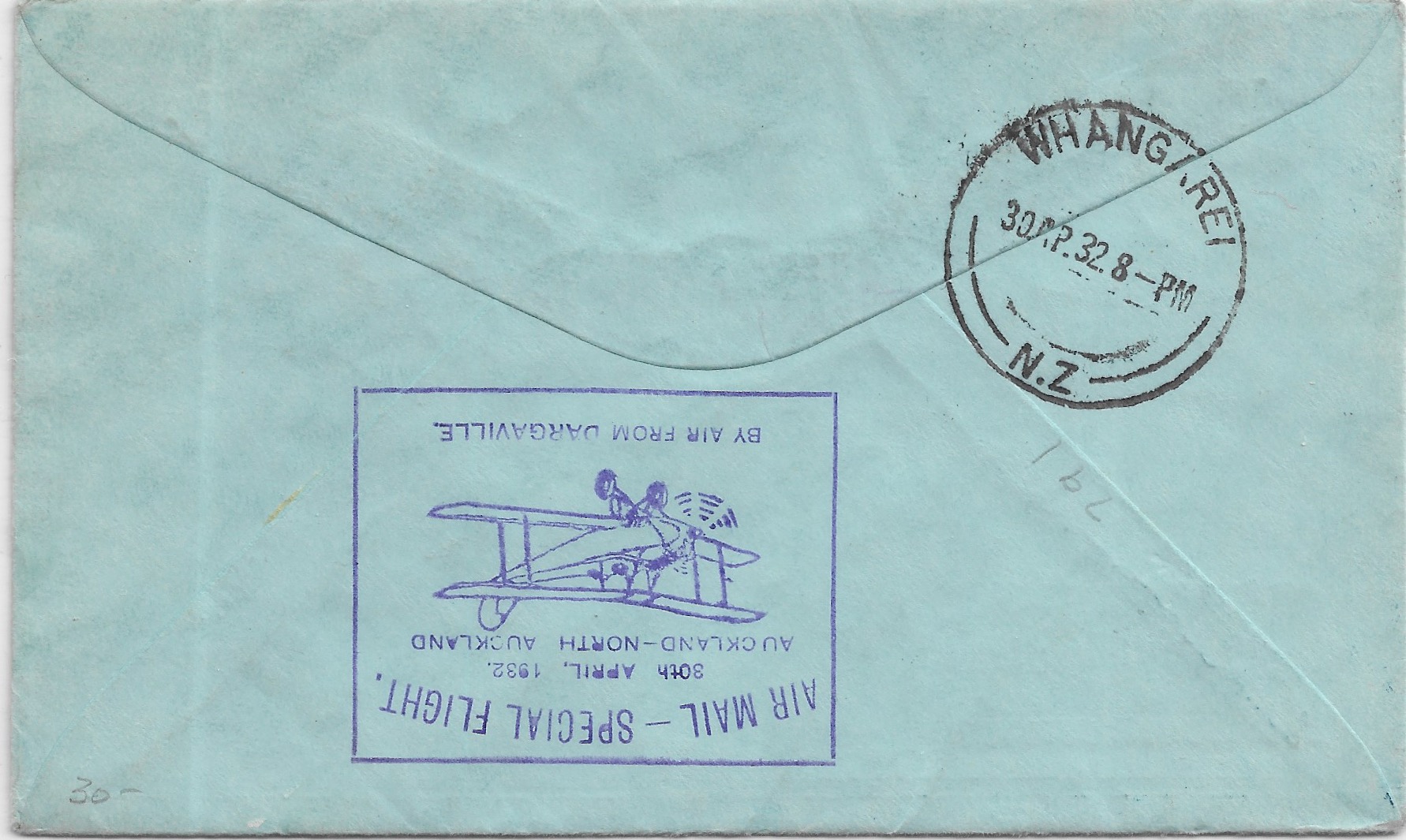 | 1932 Dargaville to Auckland, NZ via Whangarei Special Flight onward to Wooster, OH. back stamped Whangarei. | Price: $30.00