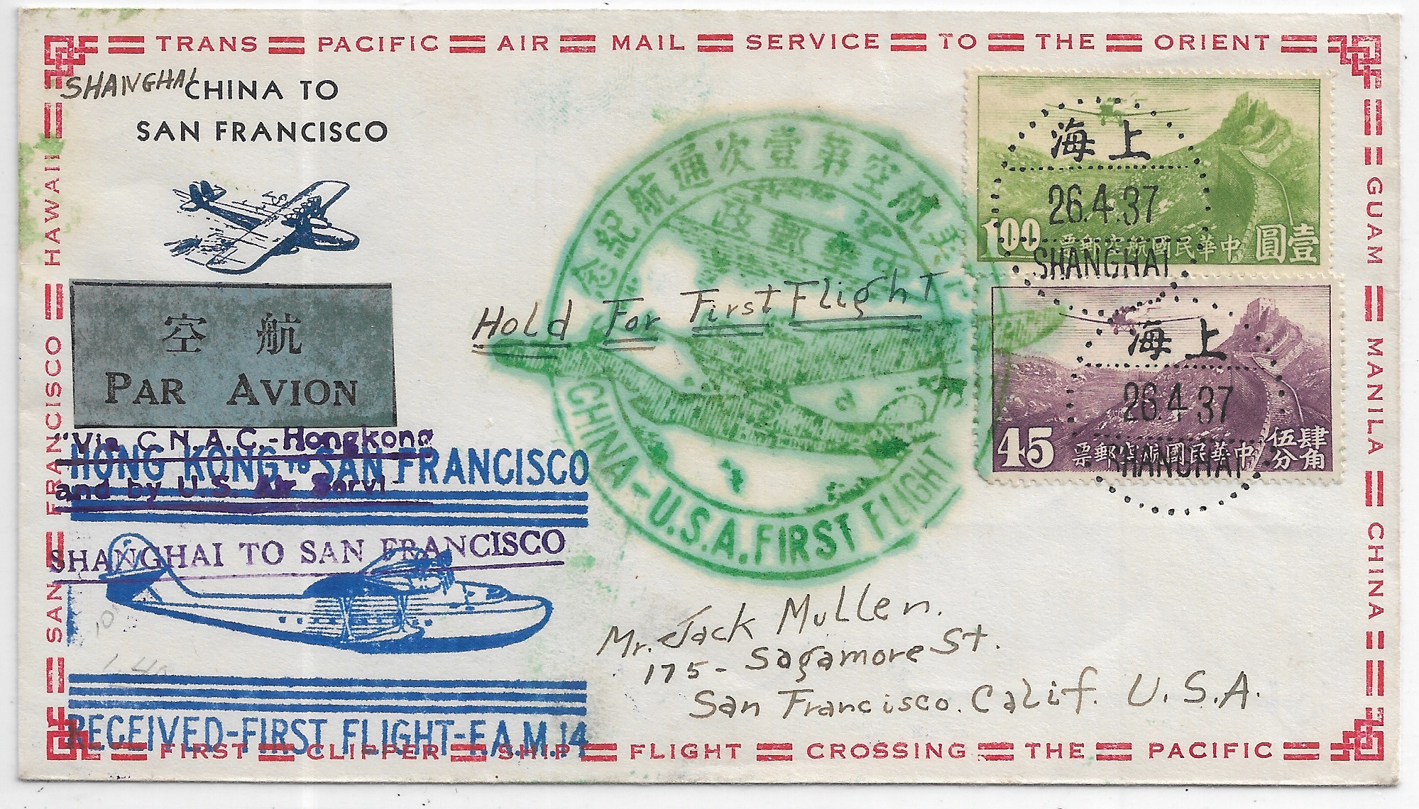 | 1937 Shanghai, China to San Francisco, Ca 1st Flight Pacific Clipper. back stamped San Francisco. | Price: $50.00