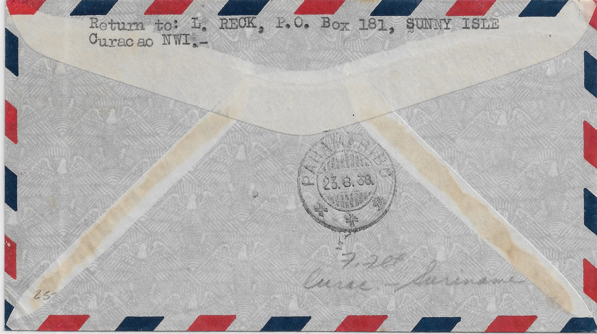 | 1938 Willemstad, Curacao to Paramaribo, Dutch Guiana 1st Flight. back stamped Paramaribo. | Price: $25.00