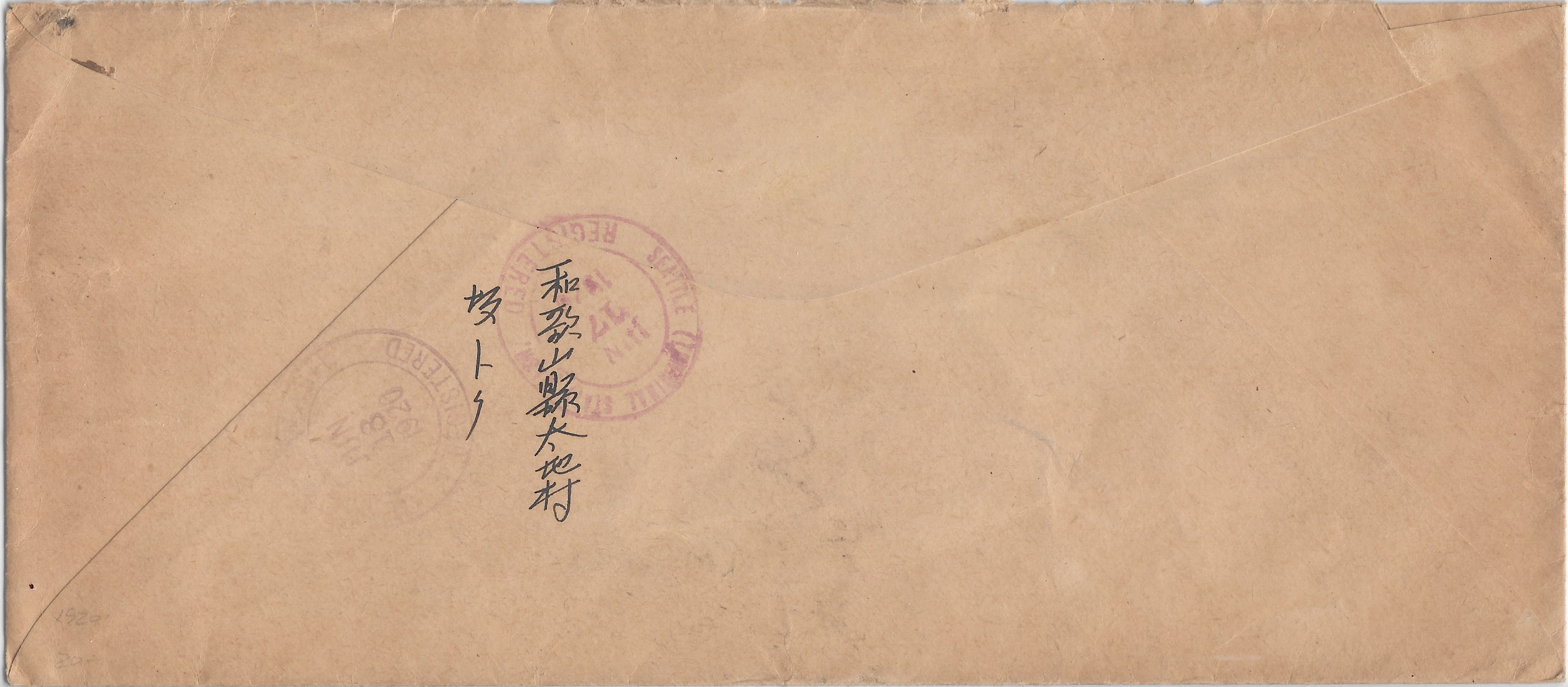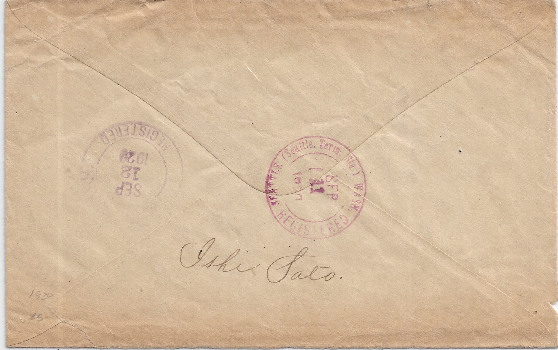 | 1920 Osaka, Japan to Olympia, Wa Registered. #10 back stamped Seattle, Olympia. | Price: $20.00