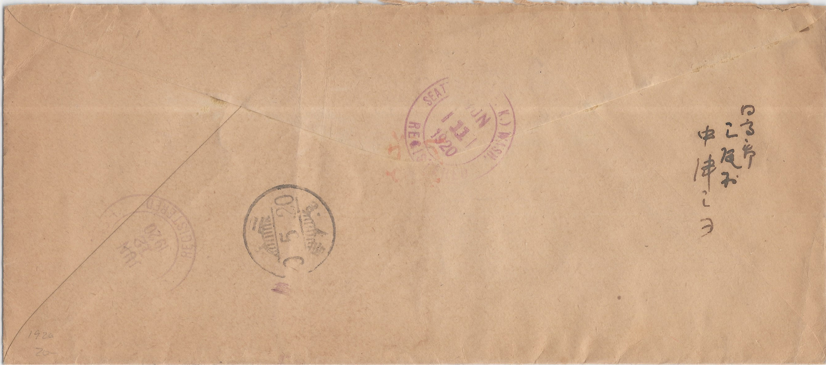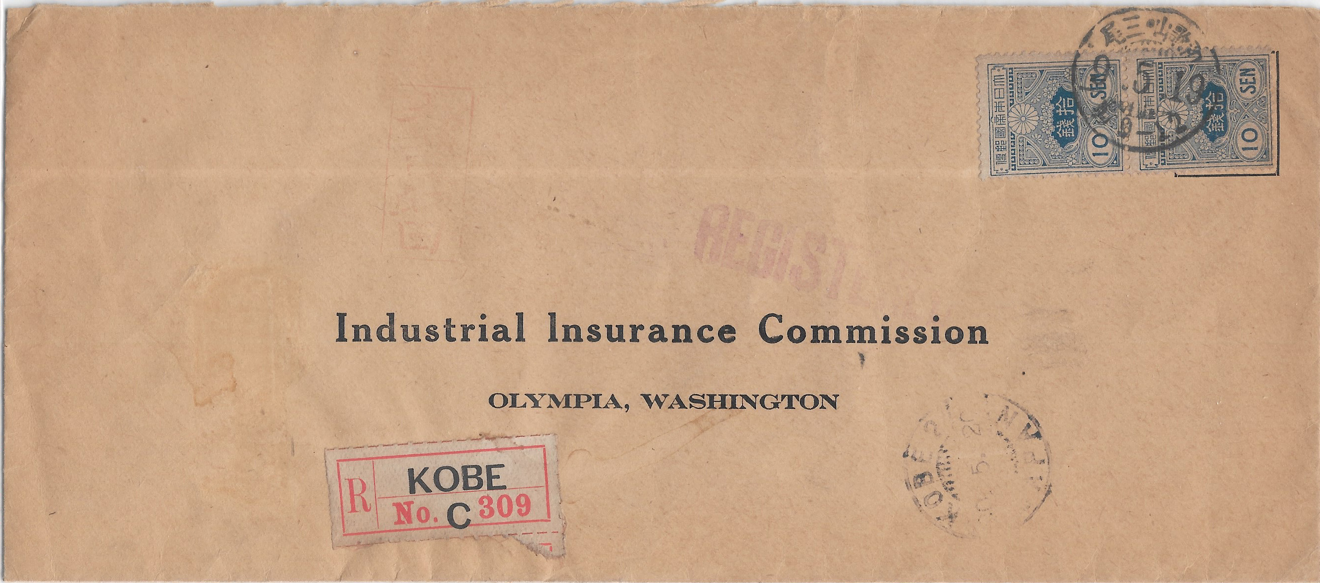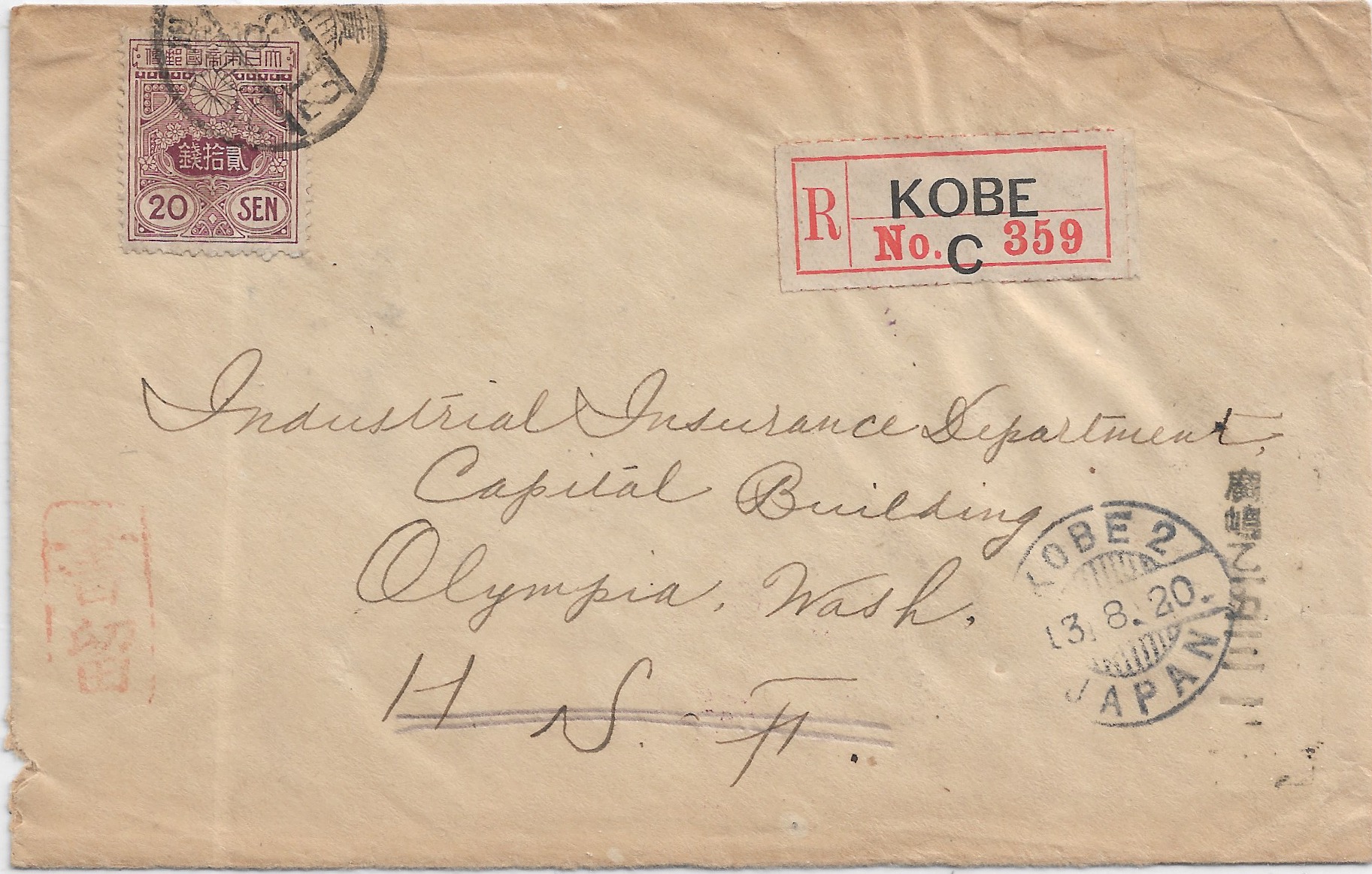 | 1920 Kobe, Japan to Olympia, Wa Registered. back stamped Seattle & Olympia. | Price: $25.00