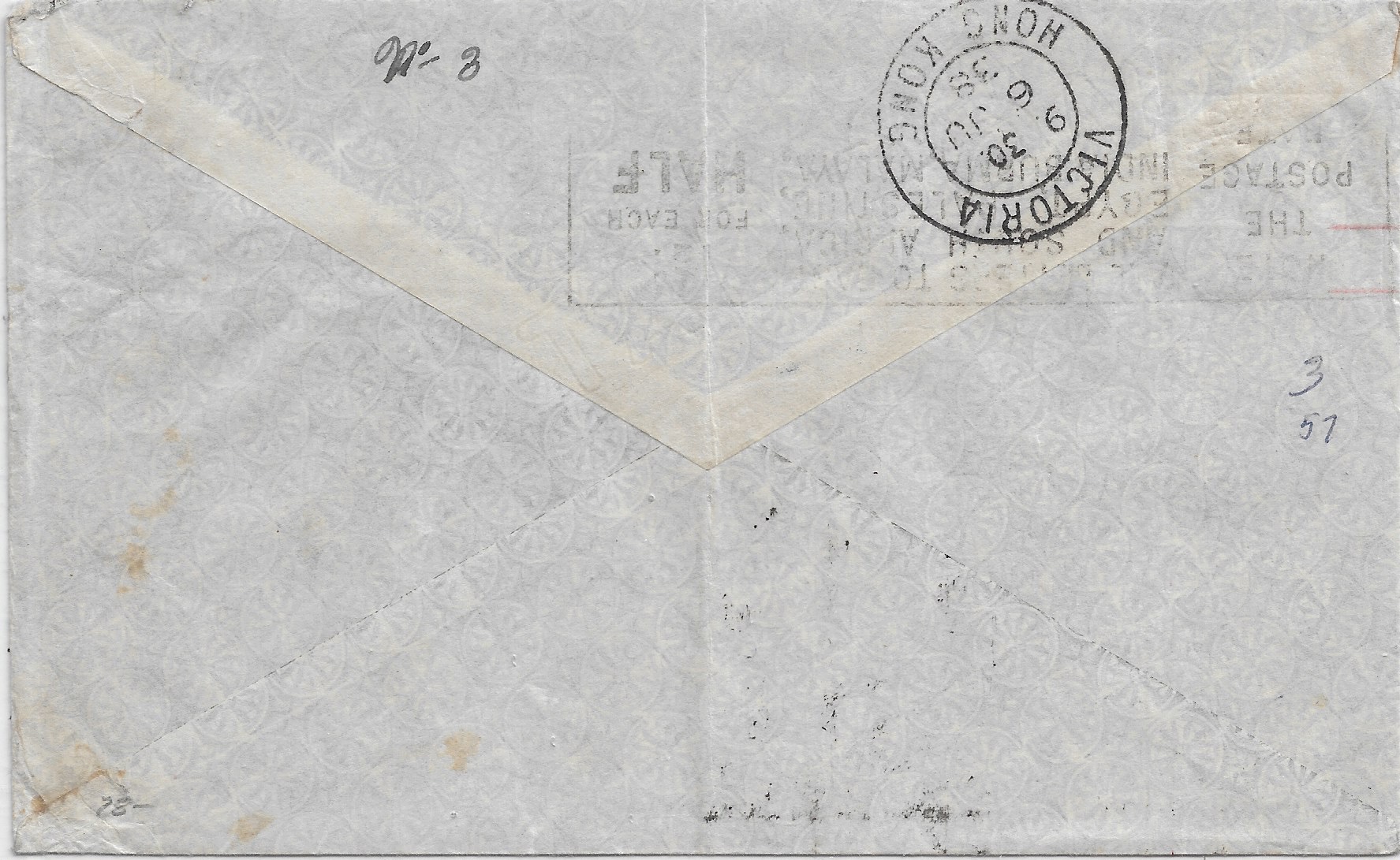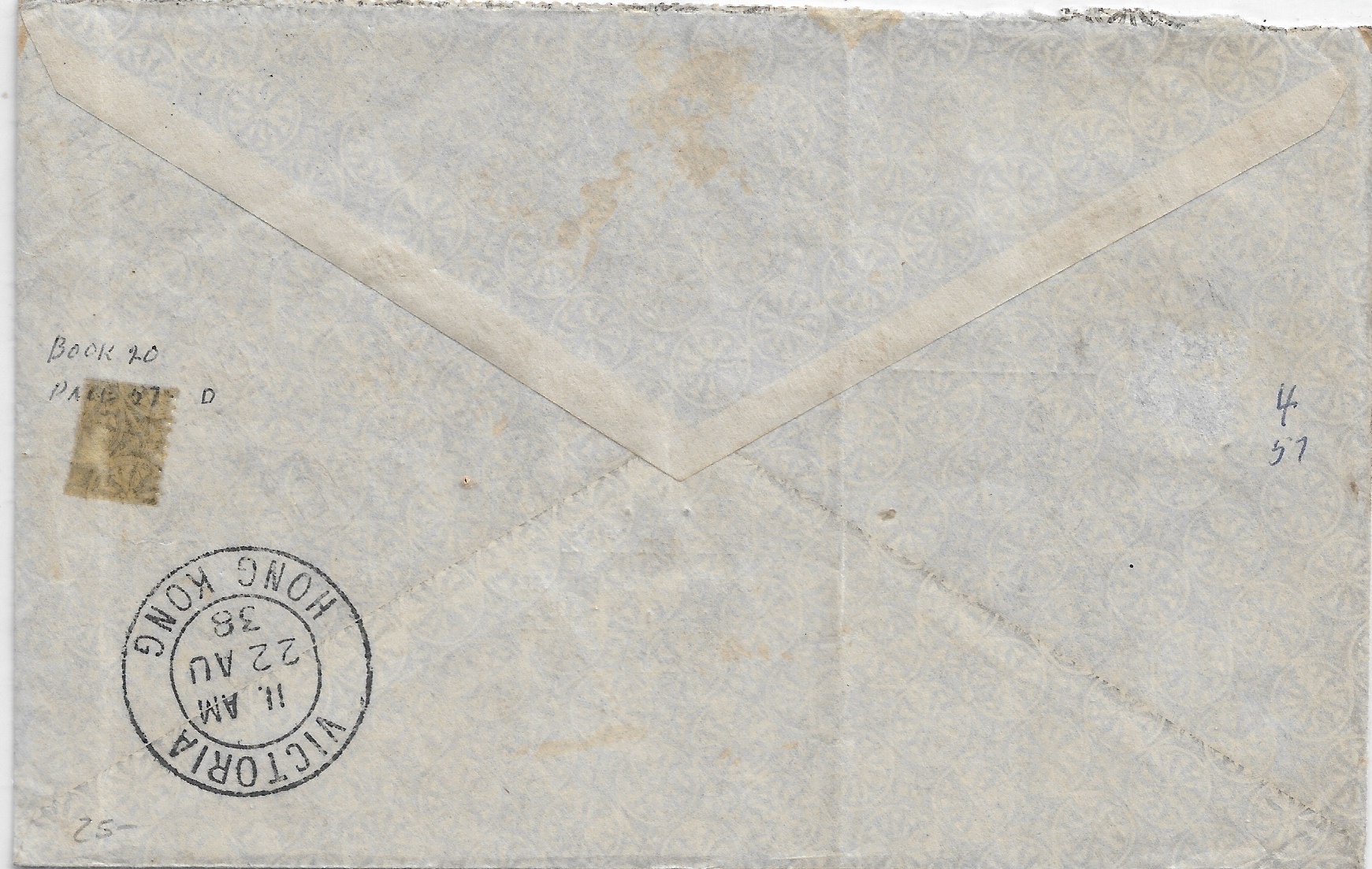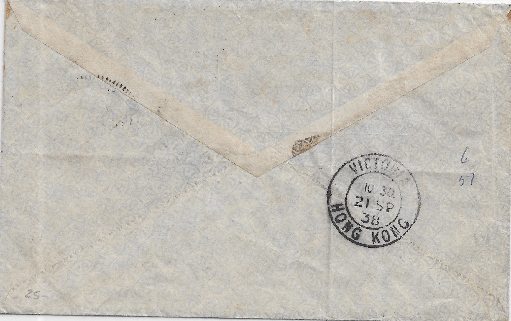 | 1938 Hankow, China to Norfolk, England Airmail. back stamped Victoria. back flap missing. | Price: $25.00